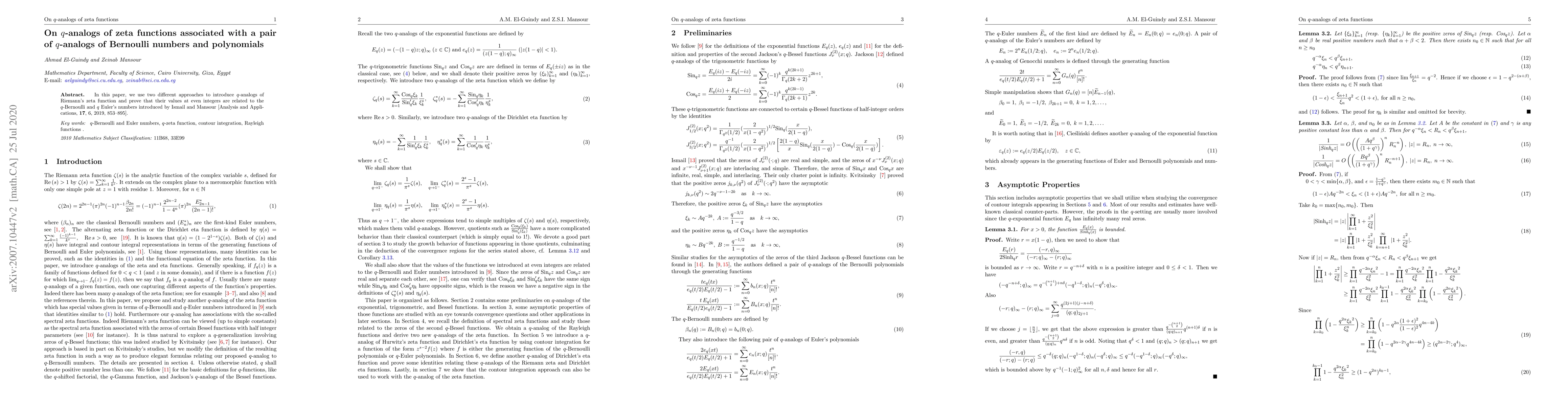 In this paper, we use two different approaches to introduce $q$-analogs of Riemann's zeta function and prove that their values at even integers are related to the $q$-Bernoulli and $q$ Euler's numbers introduced by Ismail and Mansour [Analysis and Applications, {\bf{17}}, 6, 2019, 853--895].