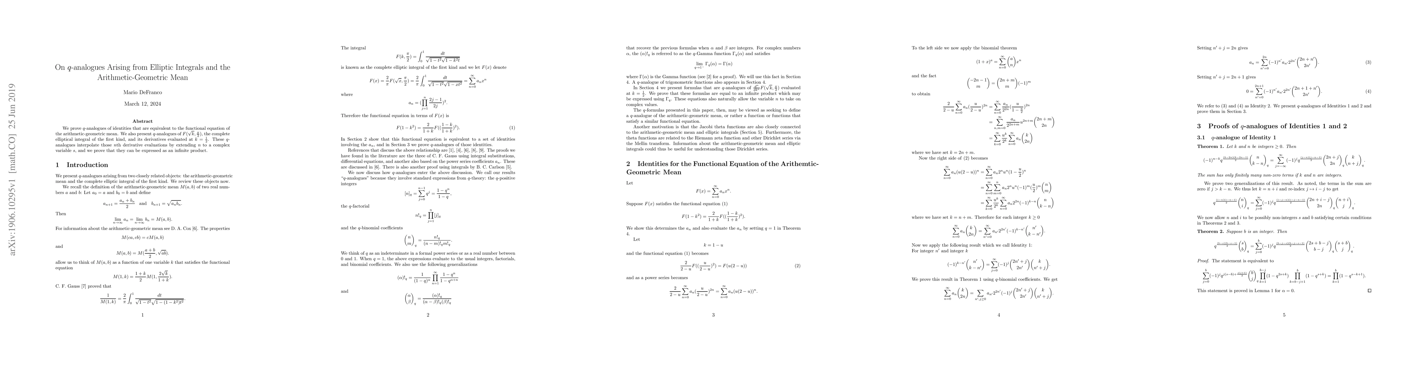 We prove $q$-analogues of identities that are equivalent to the functional equation of the arithmetic-geometric mean. We also present $q$-analogues of $F(\sqrt{k},\frac{\pi}{2})$, the complete elliptical integral of the first kind, and its derivatives evaluated at $k=\frac{1}{2}$. These $q$-analogues interpolate those $n$th derivative evaluations by extending $n$ to a complex variable $s$, and we prove that they can be expressed as an infinite product.