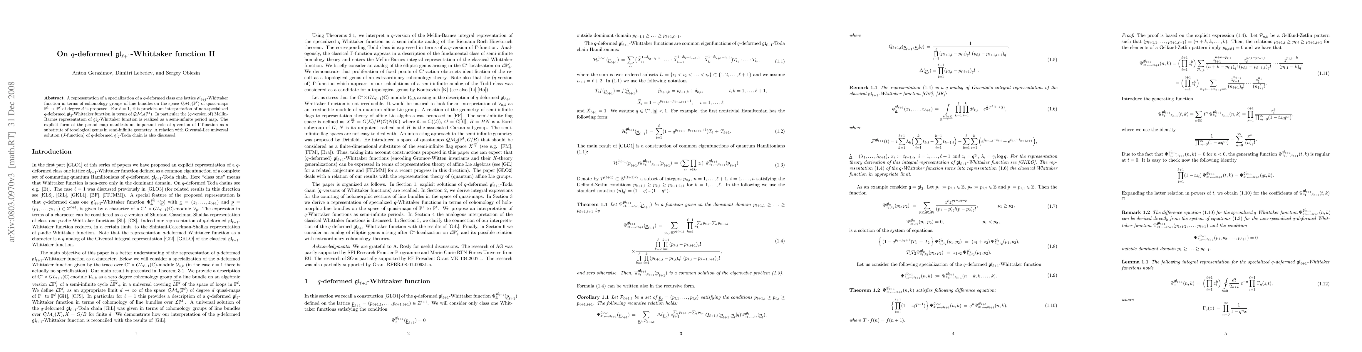 This paper proposes a representation of a q-deformed gl(l+1)-Whittaker function using cohomology groups of line bundles on quasi-map spaces, specifically interpreting the q-deformed gl(2)-Whittaker function via QM_d(\IP^1). It highlights the role of the q-version of the Gamma-function in semi-infinite geometry and discusses its relation to the Givental-Lee universal solution.