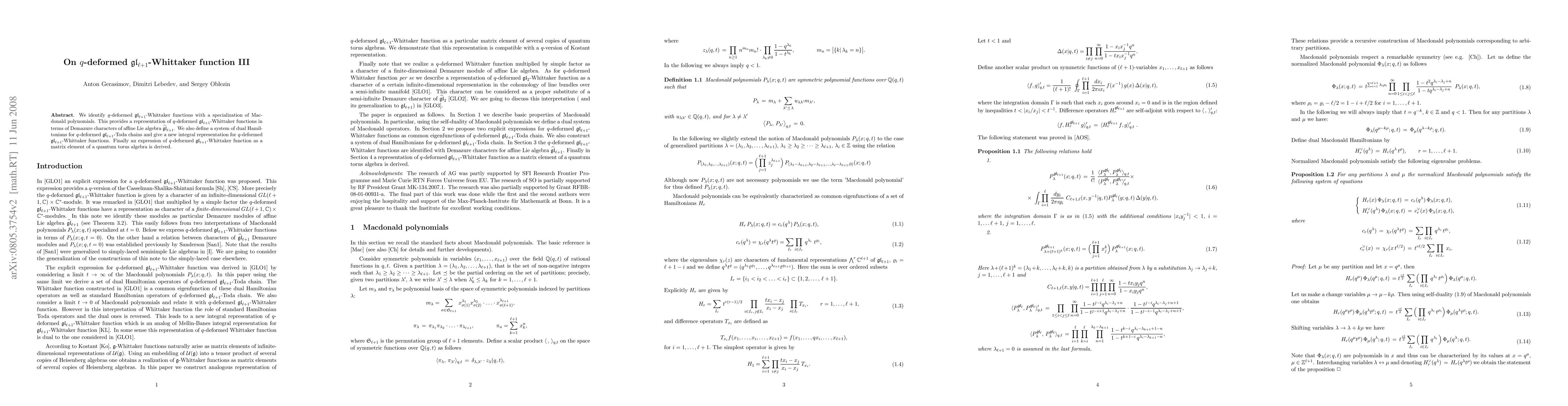 We identify q-deformed gl(l+1)-Whittaker functions with a specialization of Macdonald polynomials. This provides a representation of q-deformed gl(l+1)-Whittaker functions in terms of Demazure characters of affine Lie algebra \hat{gl(l+1)}. We also define a system of dual Hamiltonians for q-deformed gl(l+1)-Toda chains and give a new integral representation for q-deformed gl(l+1)-Whittaker functions. Finally an expression of q-deformed gl(l+1)-Whittaker function as a matrix element of a quantum torus algebra is derived.