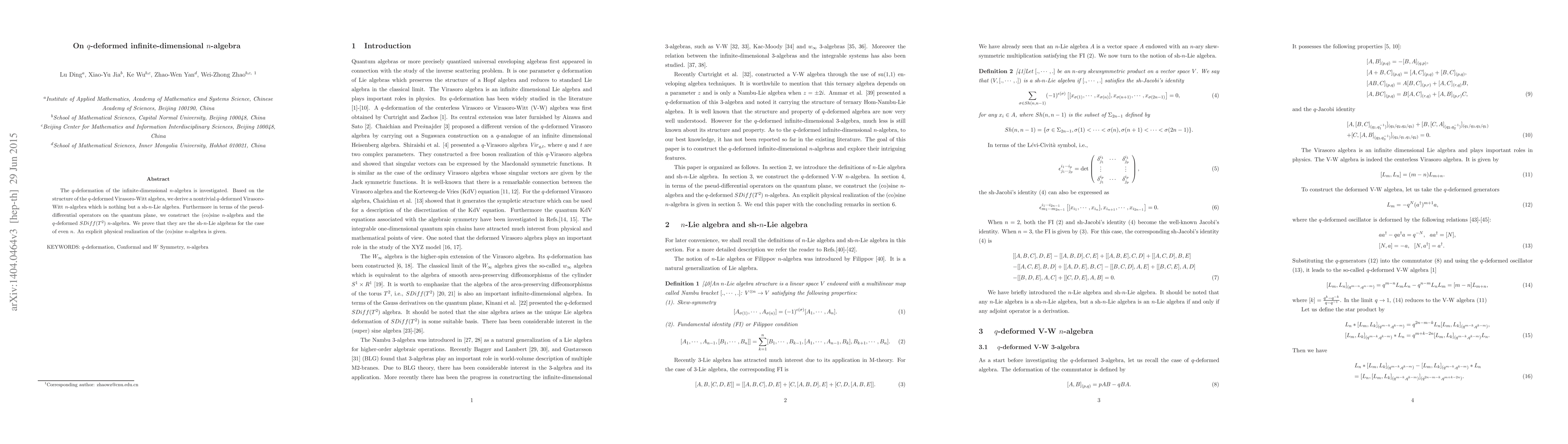 Summary: This paper investigates the $q$-deformation of the infinite-dimensional $n$-algebra, deriving a nontrivial $q$-deformed Virasoro-Witt $n$-algebra (sh-$n$-Lie algebra) based on its Virasoro-Witt structure. It constructs the (co)sine $n$-algebra and $q$-deformed $SDiff(T^2)$ $n$-algebra using pseudo-differential operators on the quantum plane, proving they are sh-$n$-Lie algebras for even $n$, with a physical realization of the (co)sine $n$-algebra provided.