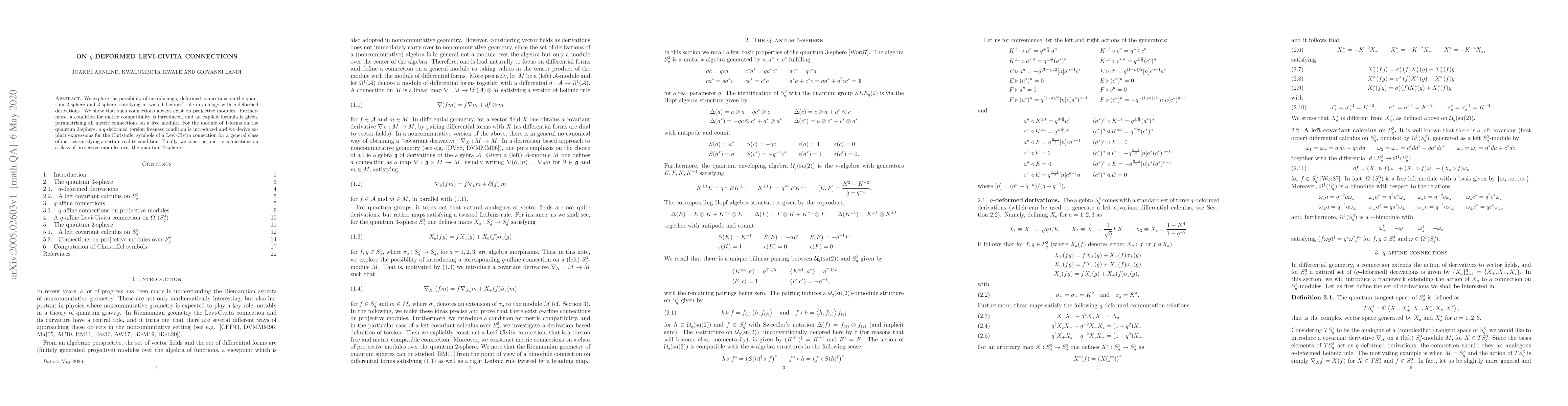 This paper investigates q-deformed connections on quantum spheres, demonstrating their existence on projective modules and deriving explicit formulas for Levi-Civita connections. It also introduces metric compatibility conditions and torsion-freeness for quantum 3-sphere 1-forms.