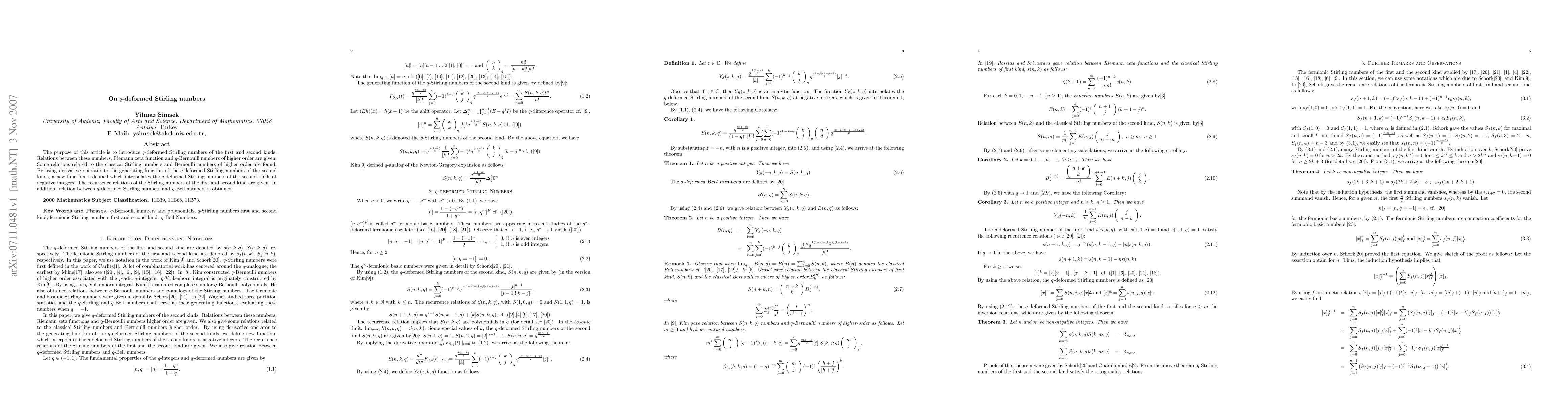 This paper introduces q-deformed Stirling numbers of the first and second kinds, exploring their relations to Riemann zeta functions, q-Bernoulli numbers, and classical Stirling and Bernoulli numbers. It defines a new function via derivative operations on generating functions that interpolates these q-deformed Stirling numbers at negative integers.