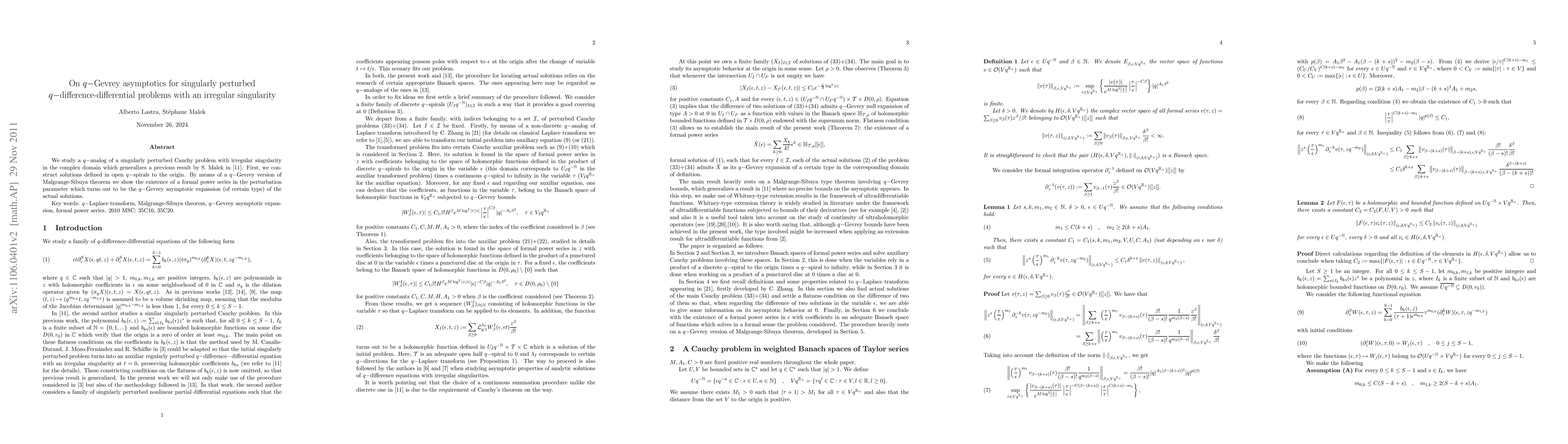 This paper investigates a $q-$analog of a singularly perturbed Cauchy problem featuring an irregular singularity, extending previous work by Malek. It constructs solutions in open $q-$spirals and demonstrates the existence of a $q-$Gevrey asymptotic expansion using a $q-$Gevrey version of the Malgrange-Sibuya theorem.
