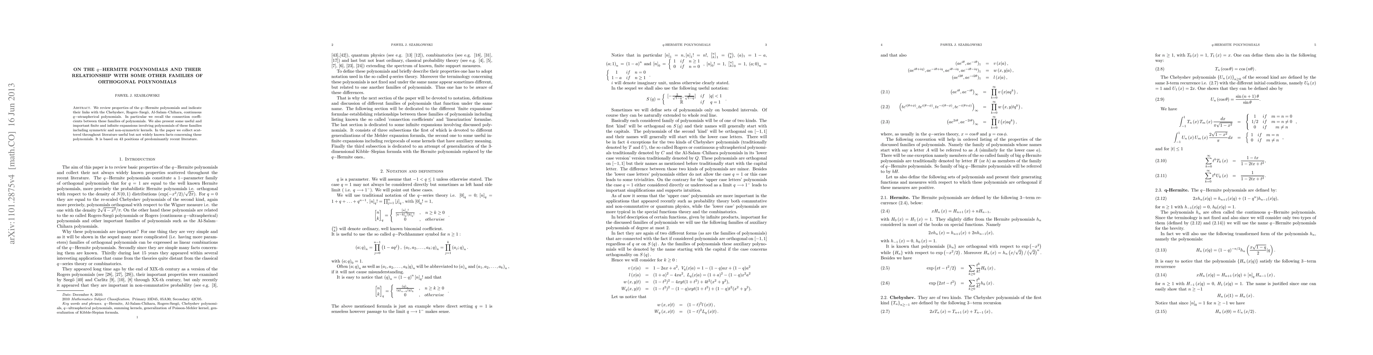 We review properties of the $q-$Hermite polynomials and indicate their links with the Chebyshev, Rogers--Szeg\"{o}, Al-Salam--Chihara, continuous $q-$% utraspherical polynomials. In particular we recall the connection coefficients between these families of polynomials. We also present some useful and important finite and infinite expansions involving polynomials of these families including symmetric and non-symmetric kernels. In the paper we collect scattered throughout literature useful but not widely known facts concerning these polynomials. It is based on 43 positions of predominantly recent literature.