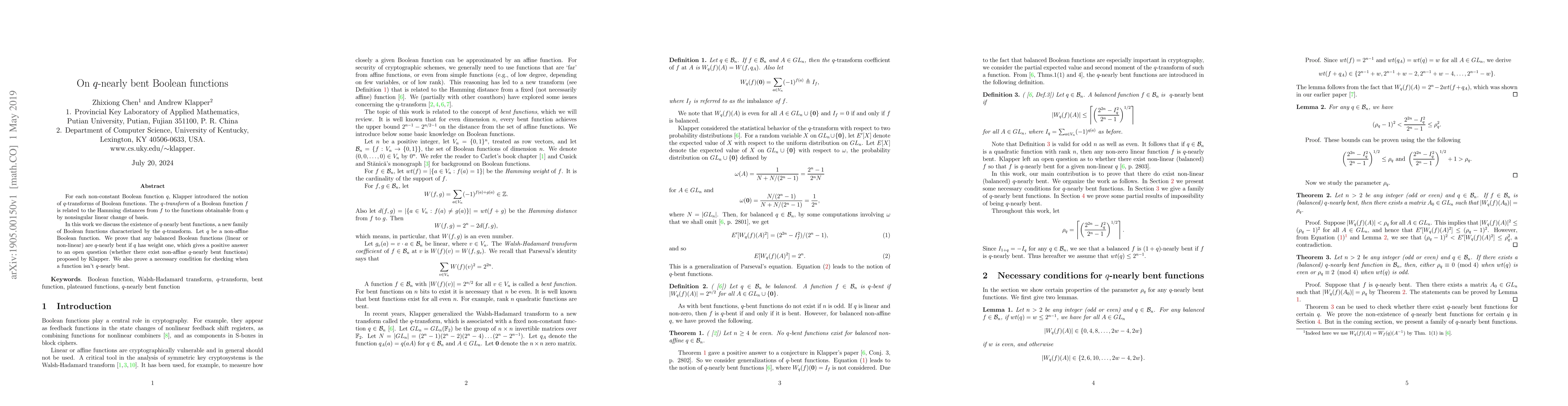 This paper explores the existence of $q$-nearly bent Boolean functions, a new class characterized by the $q$-transform introduced by Klapper. The authors prove that balanced Boolean functions are $q$-nearly bent if $q$ has weight one, answering an open question about non-affine $q$-nearly bent functions. Additionally, they provide a necessary condition for identifying functions that are not $q$-nearly bent.