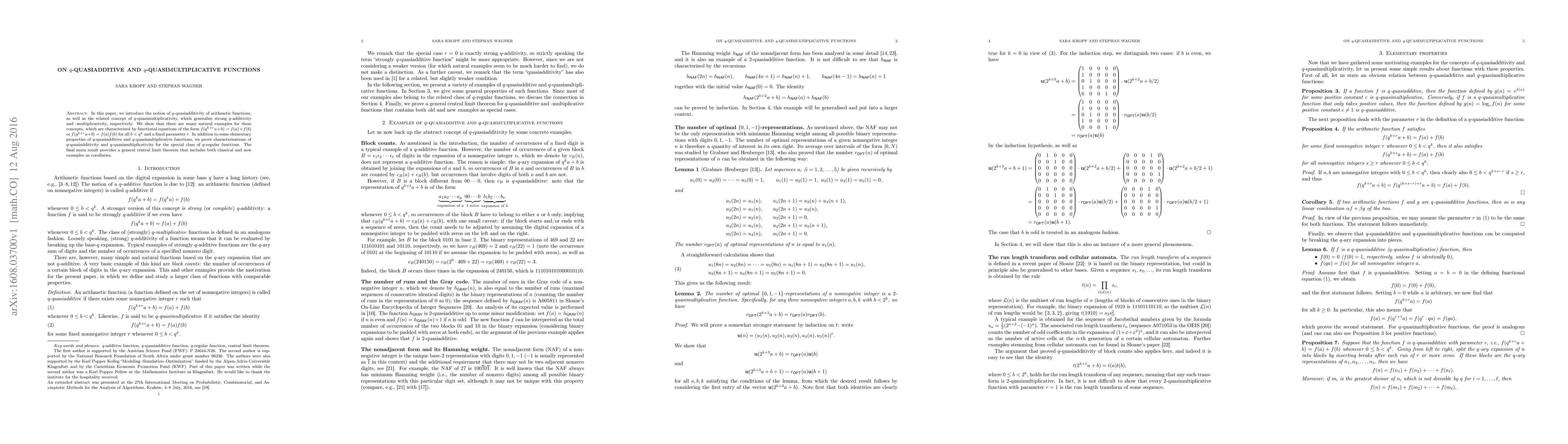 This paper introduces $q$-quasiadditive and $q$-quasimultiplicative functions, generalizing strong $q$-additivity and $q$-multiplicativity. It characterizes these functions through functional equations and provides a general central limit theorem encompassing both classical and new examples.