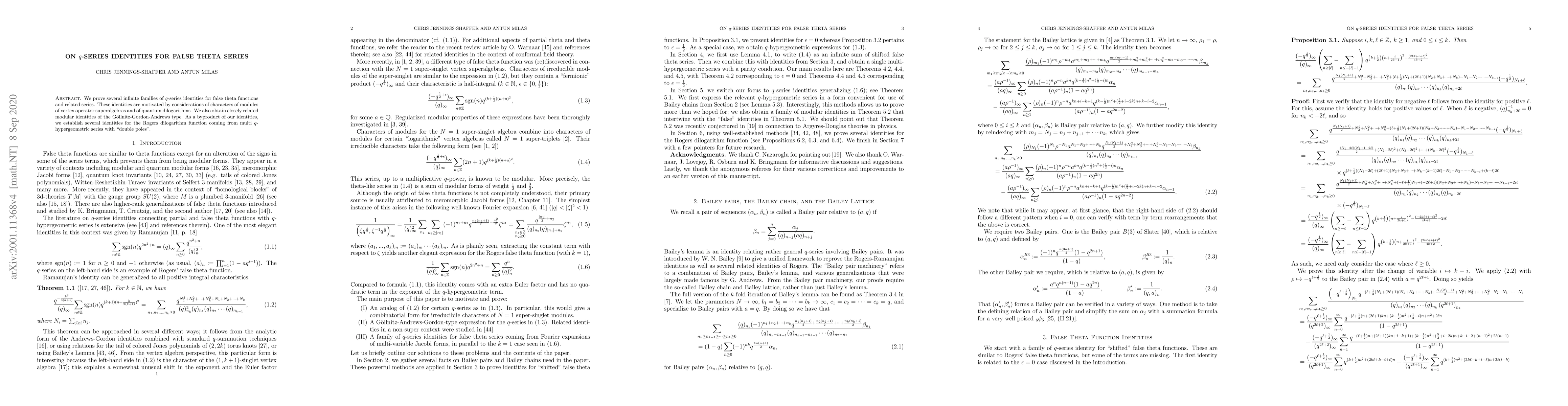 We prove several infinite families of $q$-series identities for false theta functions and related series. These identities are motivated by considerations of characters of modules of vertex operator superalgebras and of quantum dilogarithms. We also obtain closely related modular identities of the G\"ollnitz-Gordon-Andrews type. As a byproduct of our identities, we establish several identities for the Rogers dilogarithm function coming from multi $q$-hypergeometric series with "double poles".