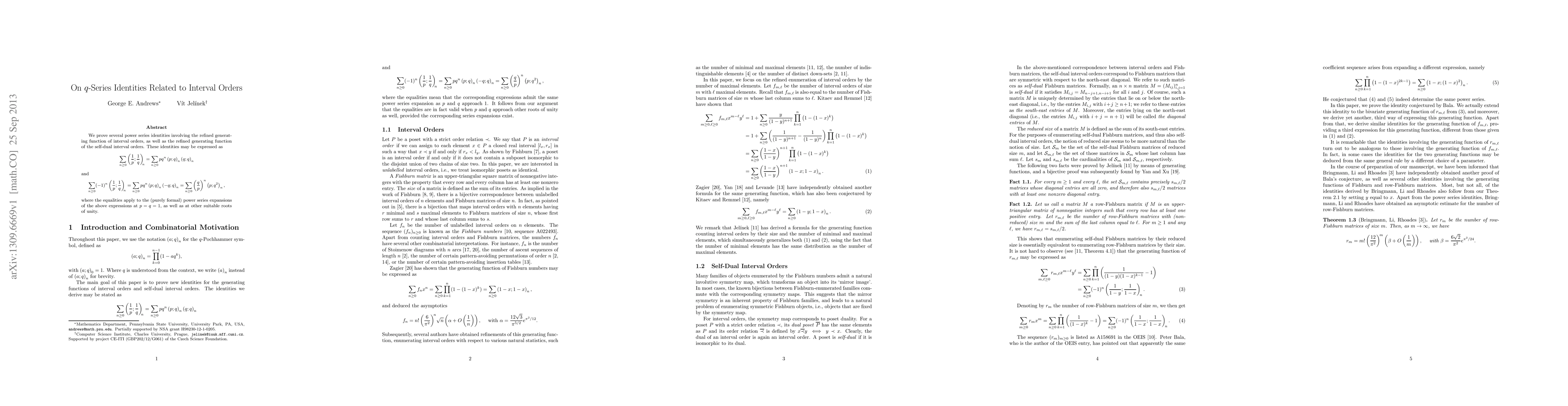 This paper proves several power series identities related to the refined generating functions of interval and self-dual interval orders, including the identity $\sum_{n\ge 0}(1/p;1/q)_n= \sum_{n\ge 0} pq^n(p;q)_n(q;q)_n$ and its variants, valid at specific roots of unity.