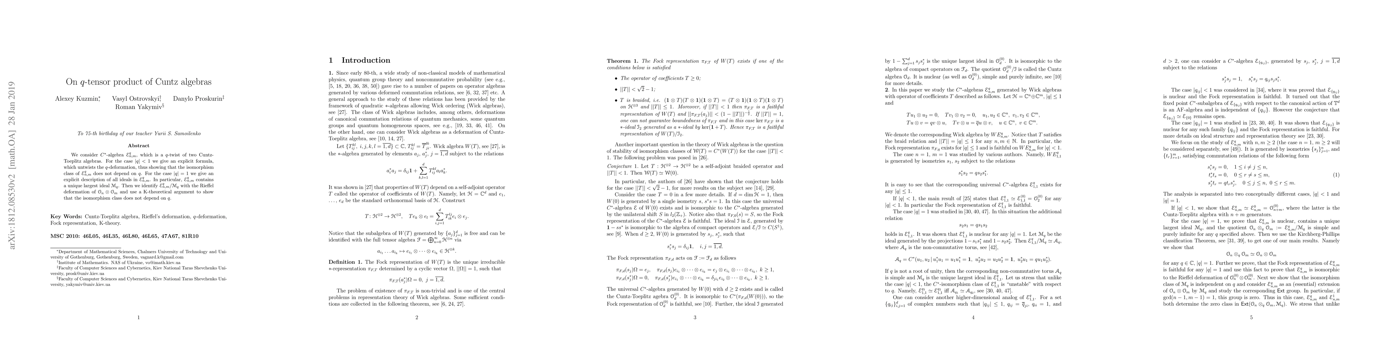 Research explores $q$-tensor products of Cuntz algebras, showing that isomorphism class does not depend on $q$, with explicit formulas for $|q|<1$ and descriptions for $|q|=1$.