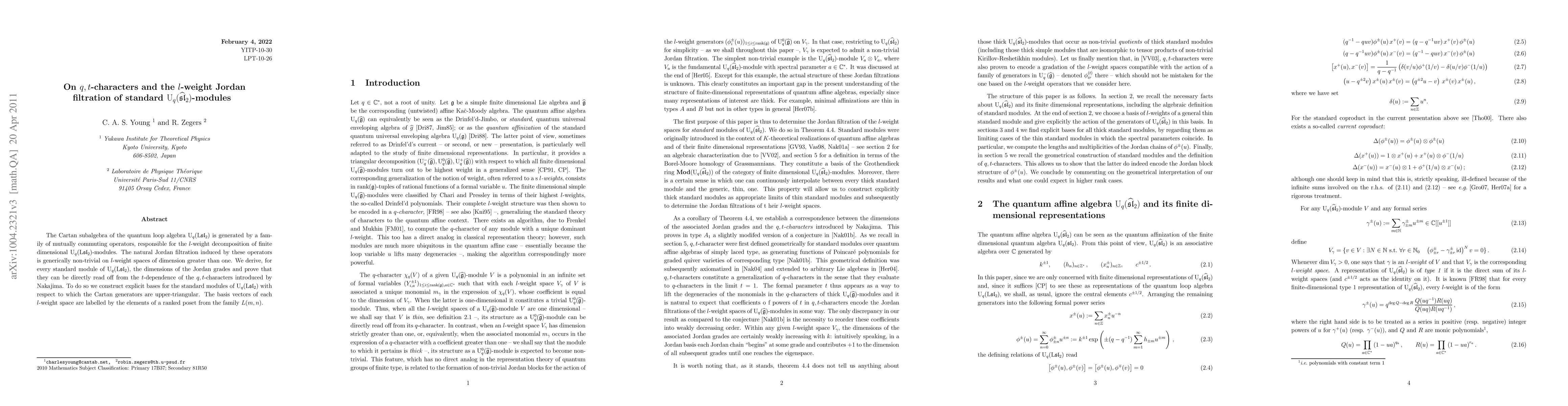 This paper investigates the l-weight Jordan filtration of standard quantum affine sl2 modules, deriving the dimensions of Jordan grades from the q,t-characters. It constructs explicit bases where Cartan generators are upper-triangular, and the dimensions can be read off from the t-dependence of these characters.