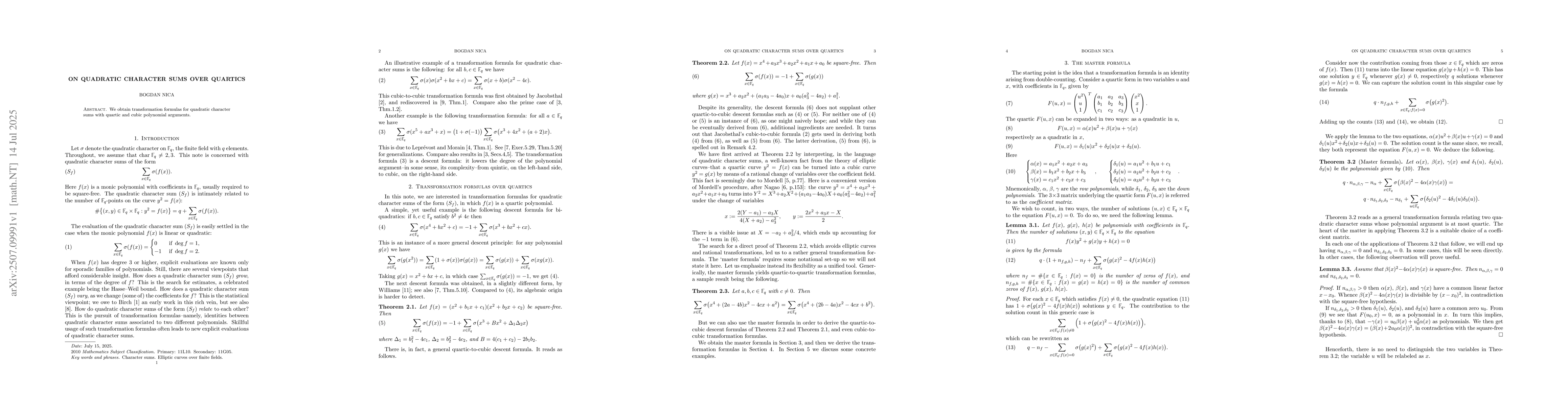 We obtain transformation formulas for quadratic character sums with quartic and cubic polynomial arguments.