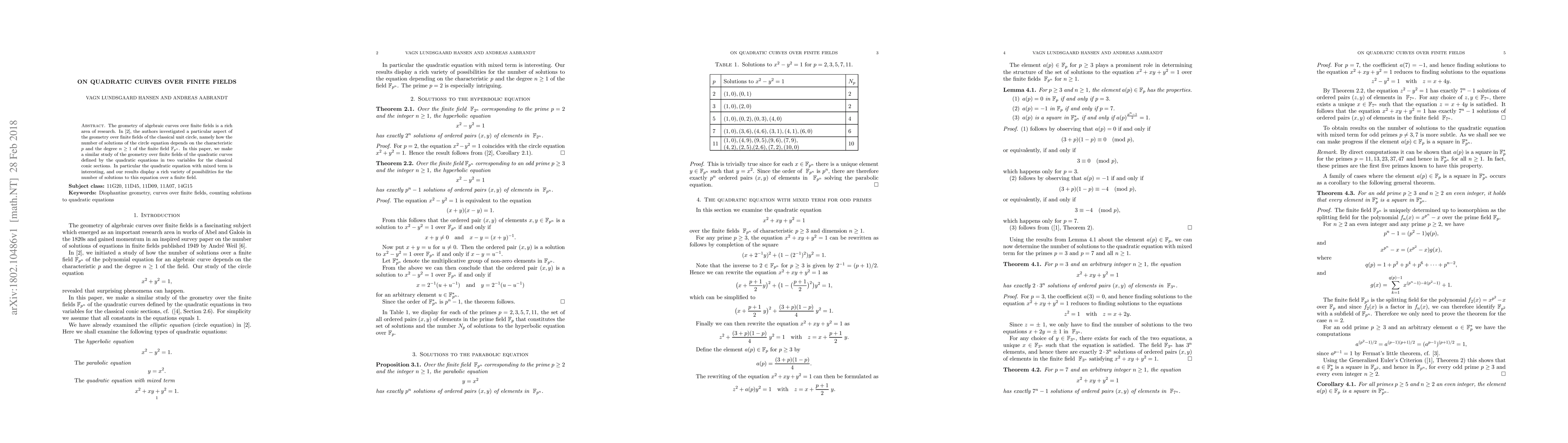 This paper examines the geometry of quadratic curves over finite fields, specifically focusing on the number of solutions for equations defining conic sections, revealing diverse possibilities dependent on the field's characteristic and degree. The study extends previous work on the unit circle to include more complex quadratic equations with mixed terms.