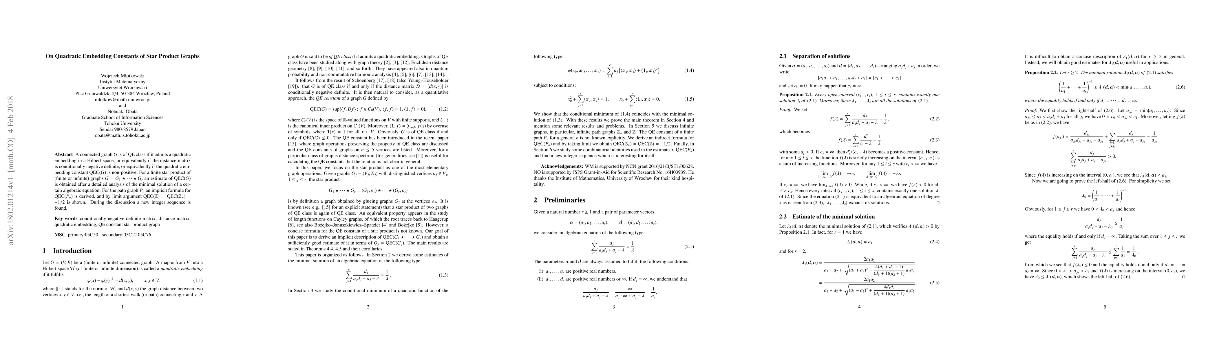 A connected graph $G$ is of QE class if it admits a quadratic embedding in a Hilbert space, or equivalently if the distance matrix is conditionally negative definite, or equivalently if the quadratic embedding constant $\mathrm{QEC}(G)$ is non-positive. For a finite star product of (finite or infinite) graphs $G=G_1\star\dotsb \star G_r$ an estimate of $\mathrm{QEC}(G)$ is obtained after a detailed analysis of the minimal solution of a certain algebraic equation. For the path graph $P_n$ an implicit formula for $\mathrm{QEC}(P_n)$ is derived, and by limit argument $\mathrm{QEC}(\mathbb{Z})=\mathrm{QEC}(\mathbb{Z}_+)=-1/2$ is shown. During the discussion a new integer sequence is found.