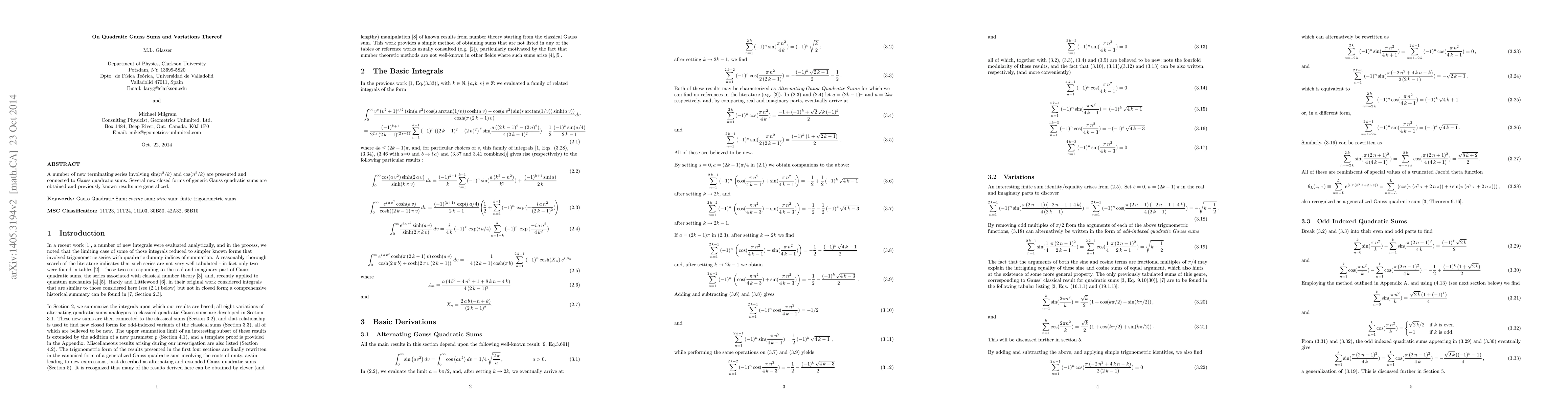 This paper introduces new terminating series involving $\sin(n^2/k)$ and $\cos(n^2/k)$ and connects them to Gauss quadratic sums, deriving several new closed forms for these sums and generalizing previously known results.