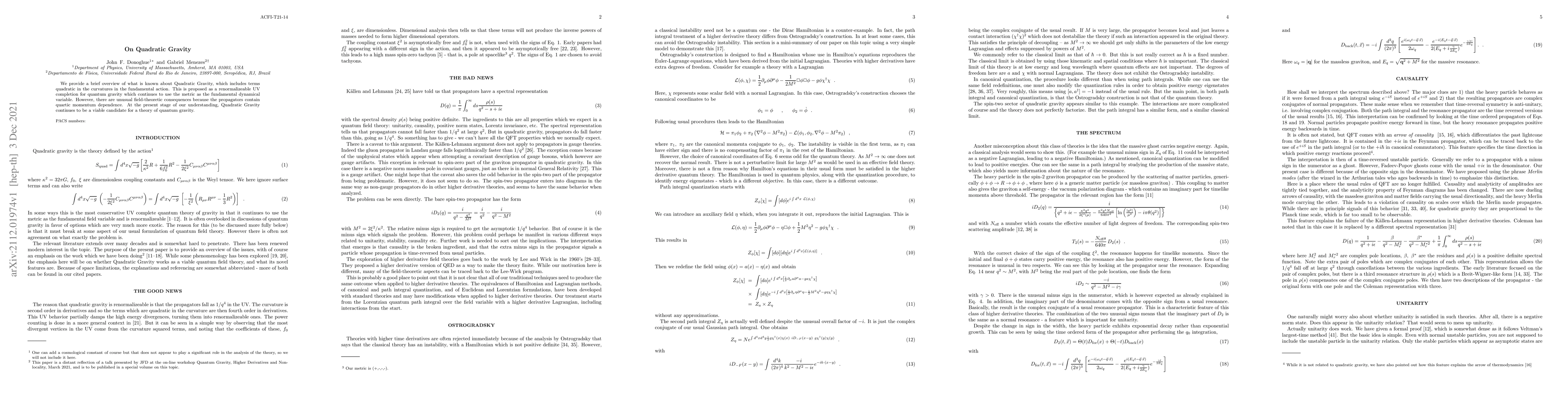 We provide a brief overview of what is known about Quadratic Gravity, which includes terms quadratic in the curvatures in the fundamental action. This is proposed as a renormalizeable UV completion for quantum gravity which continues to use the metric as the fundamental dynamical variable. However, there are unusual field-theoretic consequences because the propagators contain quartic momentum dependence. At the present stage of our understanding, Quadratic Gravity continues to be a viable candidate for a theory of quantum gravity.