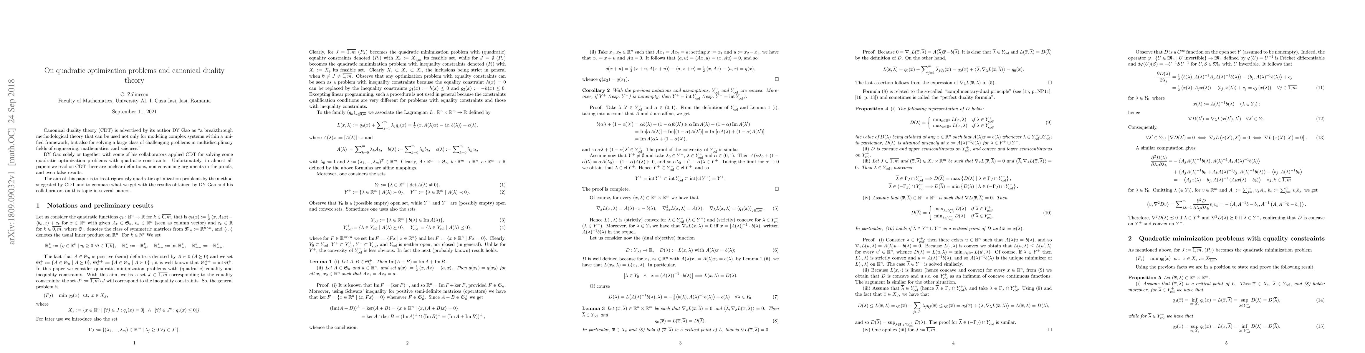 DY Gao solely or together with some of his collaborators applied his Canonical duality theory (CDT) for solving some quadratic optimization problems with quadratic constraints. Unfortunately, in almost all papers we read on CDT there are unclear definitions, non convincing arguments in the proofs, and even false results. The aim of this paper is to treat rigorously quadratic optimization problems by the method suggested by CDT and to compare what we get with the results obtained by DY Gao and his collaborators on this topic in several papers.