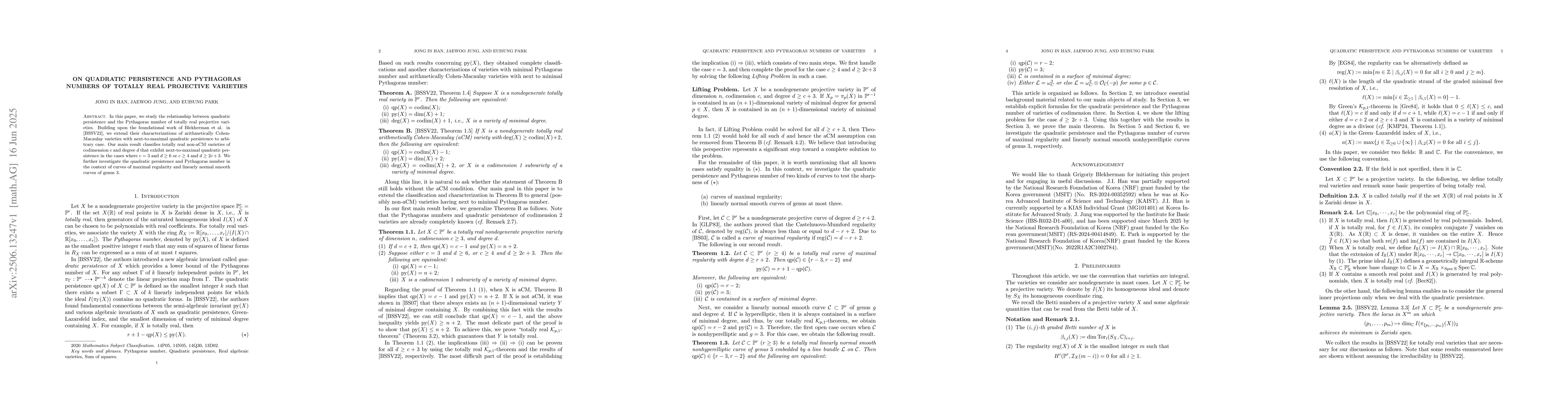 In this paper, we study the relationship between quadratic persistence and the Pythagoras number of totally real projective varieties. Building upon the foundational work of Blekherman et al. in arXiv:1902.02754, we extend their characterizations of arithmetically Cohen-Macaulay varieties with next-to-maximal quadratic persistence to arbitrary case. Our main result classifies totally real non-aCM varieties of codimension $c$ and degree $d$ that exhibit next-to-maximal quadratic persistence in the cases where $c=3$ and $d \geq 6$ or $c \geq 4$ and $d \geq 2c+3$. We further investigate the quadratic persistence and Pythagoras number in the context of curves of maximal regularity and linearly normal smooth curves of genus 3.
