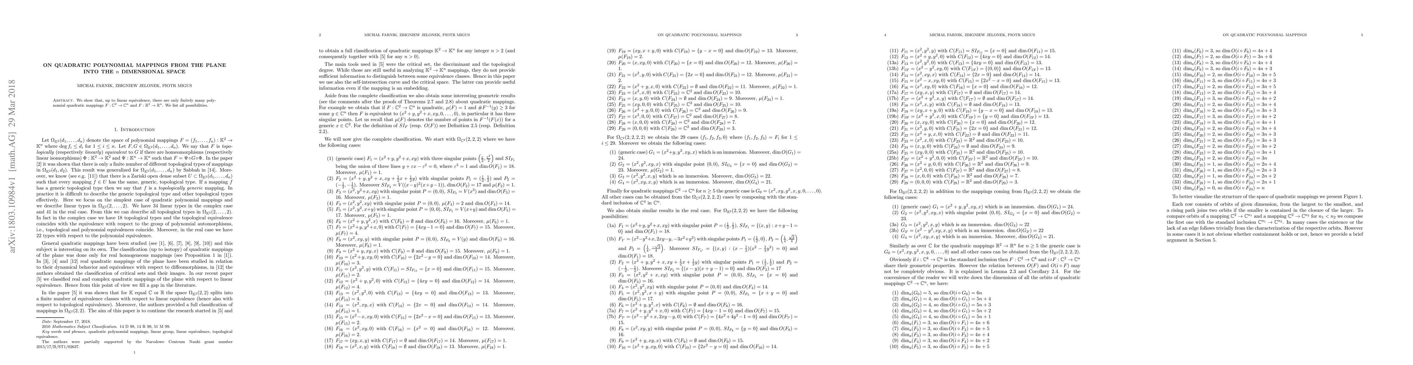 We show that, up to linear equivalence, there are only finitely many polynomial quadratic mappings $F:\mathbb{C}^2\to\mathbb{C}^n$ and $F:\mathbb{R}^2\to\mathbb{R}^n$. We list all possibilities.