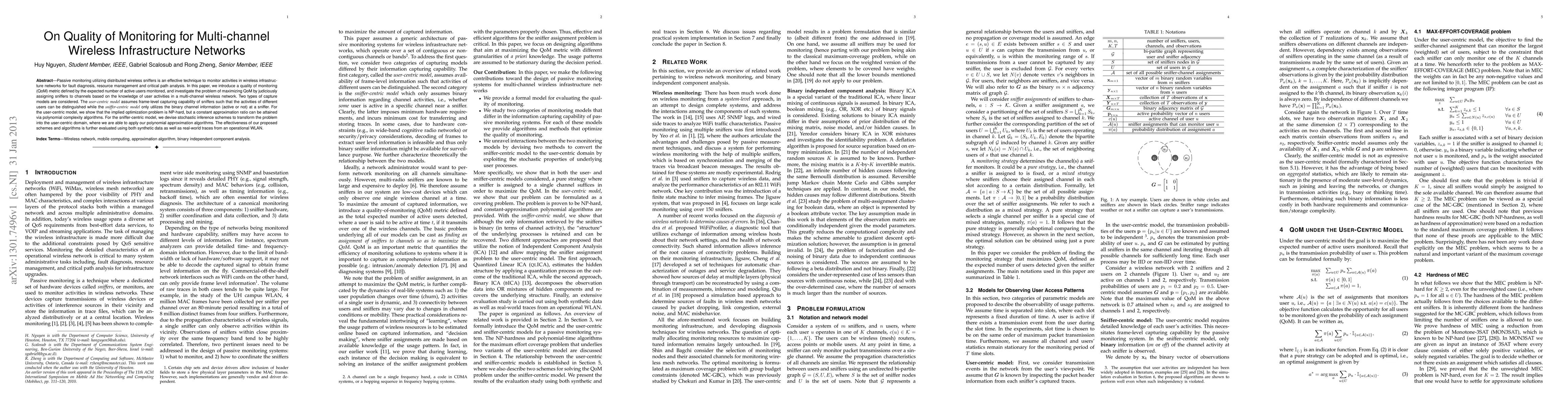 Passive monitoring utilizing distributed wireless sniffers is an effective technique to monitor activities in wireless infrastructure networks for fault diagnosis, resource management and critical path analysis. In this paper, we introduce a quality of monitoring (QoM) metric defined by the expected number of active users monitored, and investigate the problem of maximizing QoM by judiciously assigning sniffers to channels based on the knowledge of user activities in a multi-channel wireless network. Two types of capture models are considered. The user-centric model assumes frame-level capturing capability of sniffers such that the activities of different users can be distinguished while the sniffer-centric model only utilizes the binary channel information (active or not) at a sniffer. For the user-centric model, we show that the implied optimization problem is NP-hard, but a constant approximation ratio can be attained via polynomial complexity algorithms. For the sniffer-centric model, we devise stochastic inference schemes to transform the problem into the user-centric domain, where we are able to apply our polynomial approximation algorithms. The effectiveness of our proposed schemes and algorithms is further evaluated using both synthetic data as well as real-world traces from an operational WLAN.