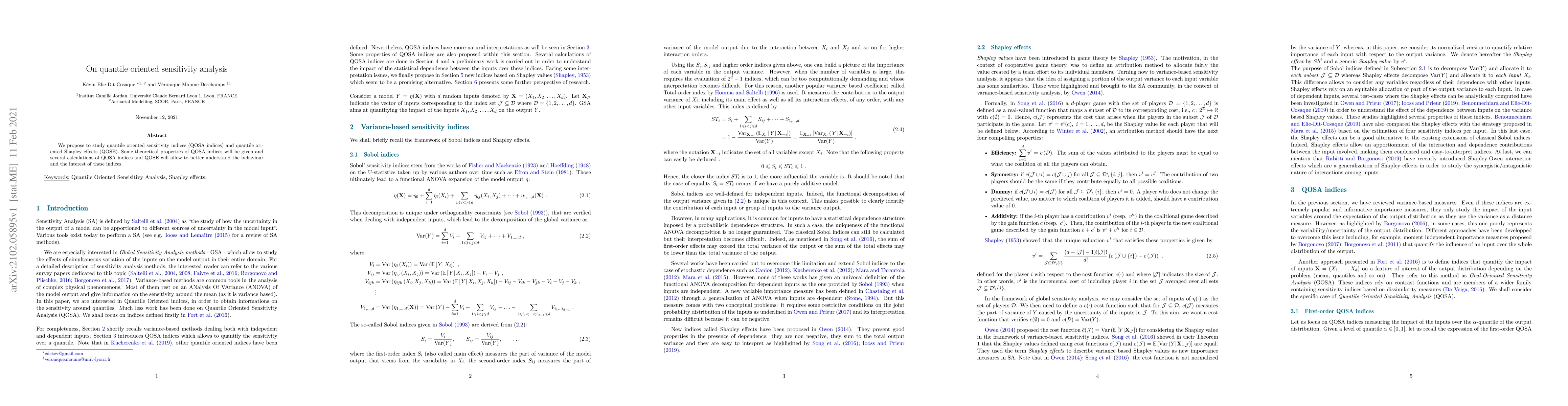This paper introduces quantile oriented sensitivity indices (QOSA indices) and quantile oriented Shapley effects (QOSE), providing theoretical properties and calculations to elucidate their behavior and utility in sensitivity analysis.
