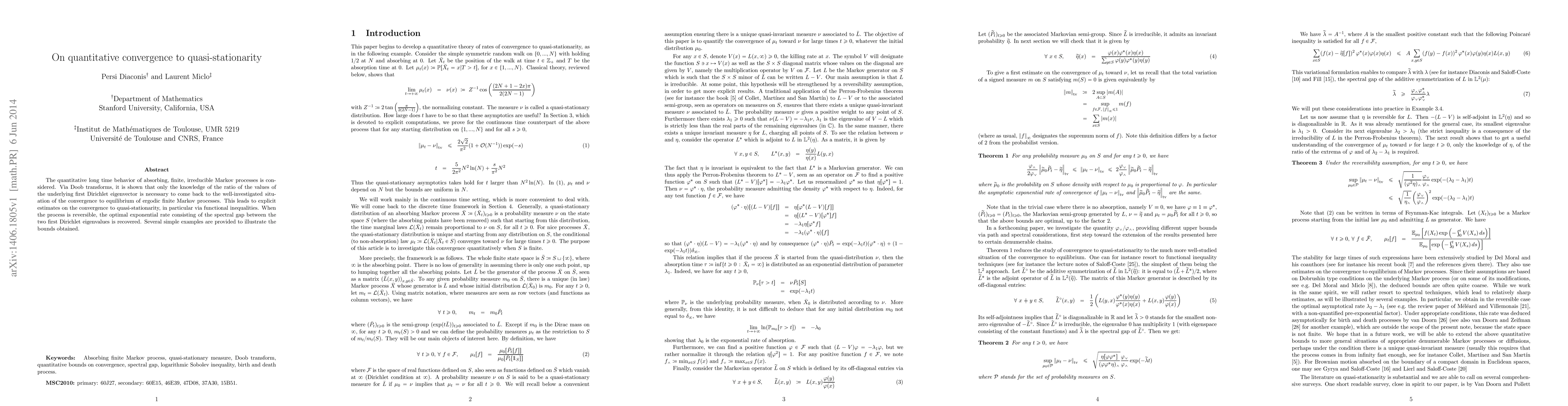 This paper studies how Markov processes converge to quasi-stationarity over long periods, showing that only knowing the ratio of certain eigenvalues is needed to analyze convergence. It provides explicit estimates using functional inequalities and recovers optimal exponential rates in reversible cases.