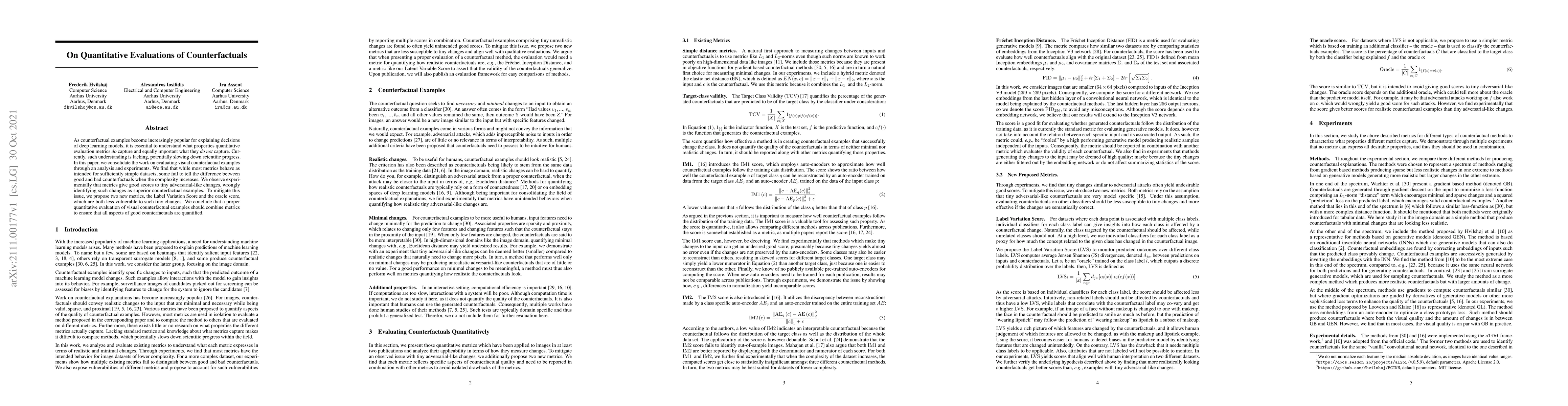 As counterfactual examples become increasingly popular for explaining decisions of deep learning models, it is essential to understand what properties quantitative evaluation metrics do capture and equally important what they do not capture. Currently, such understanding is lacking, potentially slowing down scientific progress. In this paper, we consolidate the work on evaluating visual counterfactual examples through an analysis and experiments. We find that while most metrics behave as intended for sufficiently simple datasets, some fail to tell the difference between good and bad counterfactuals when the complexity increases. We observe experimentally that metrics give good scores to tiny adversarial-like changes, wrongly identifying such changes as superior counterfactual examples. To mitigate this issue, we propose two new metrics, the Label Variation Score and the Oracle score, which are both less vulnerable to such tiny changes. We conclude that a proper quantitative evaluation of visual counterfactual examples should combine metrics to ensure that all aspects of good counterfactuals are quantified.