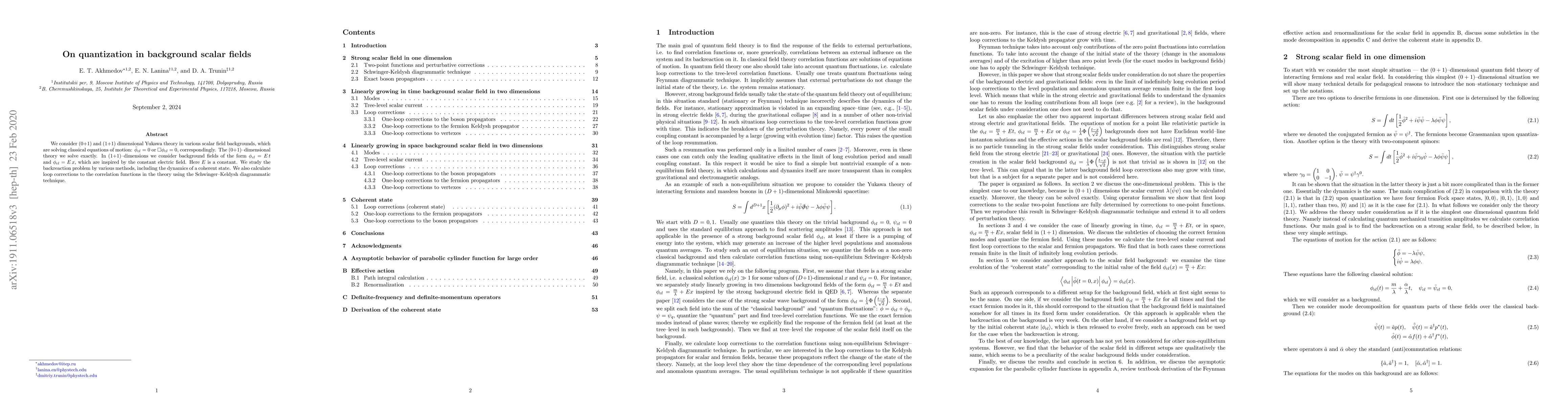 We consider (0+1) and (1+1) dimensional Yukawa theory in various scalar field backgrounds, which are solving classical equations of motion: $\ddot{\phi}_{cl} = 0$ or $\Box \phi_{cl} = 0$, correspondingly. The (0+1)--dimensional theory we solve exactly. In (1+1)--dimensions we consider background fields of the form $\phi_{cl} = E\, t$ and $\phi_{cl} = E\, x$, which are inspired by the constant electric field. Here $E$ is a constant. We study the backreaction problem by various methods, including the dynamics of a coherent state. We also calculate loop corrections to the correlation functions in the theory using the Schwinger--Keldysh diagrammatic technique.