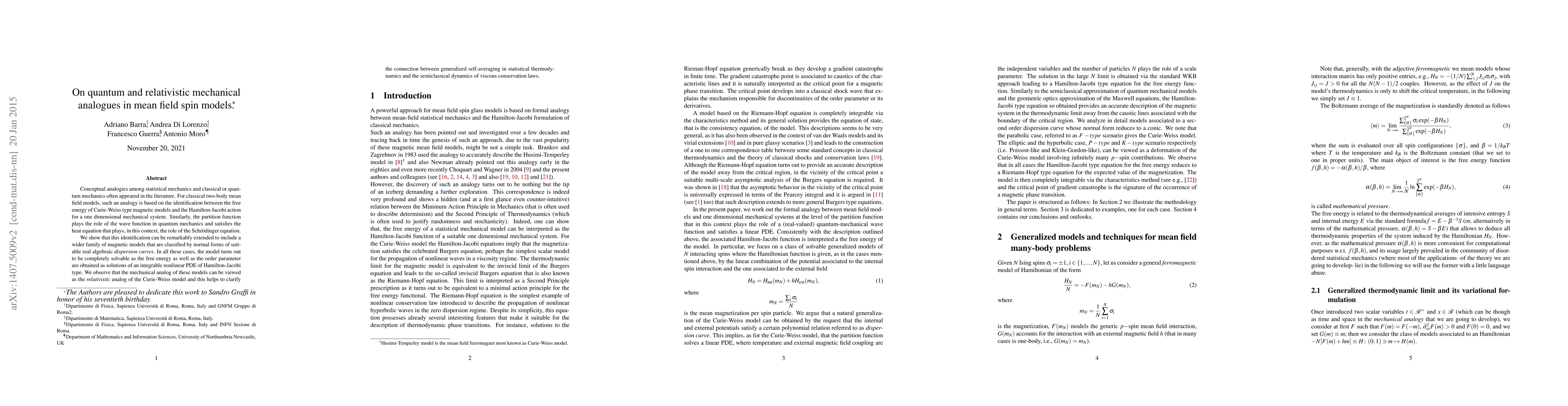 Conceptual analogies among statistical mechanics and classical (or quantum) mechanics often appeared in the literature. For classical two-body mean field models, an analogy develops into a proper identification between the free energy of Curie-Weiss type magnetic models and the Hamilton-Jacobi action for a one dimensional mechanical system. Similarly, the partition function plays the role of the wave function in quantum mechanics and satisfies the heat equation that plays, in this context, the role of the Schrodinger equation in quantum mechanics. We show that this identification can be remarkably extended to include a wide family of magnetic models classified by normal forms of suitable real algebraic dispersion curves. In all these cases, the model turns out to be completely solvable as the free energy as well as the order parameter are obtained as solutions of an integrable nonlinear PDE of Hamilton-Jacobi type. We observe that the mechanical analog of these models can be viewed as the relativistic analog of the Curie-Weiss model and this helps to clarify the connection between generalised self-averaging and in statistical thermodynamics and the semi-classical dynamics of viscous conservation laws.