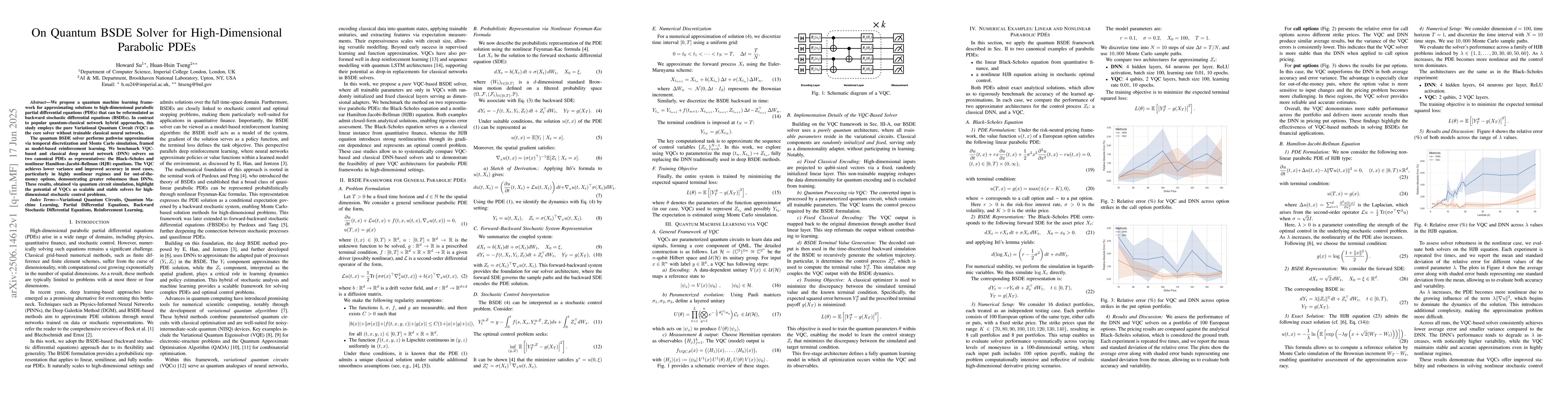 We propose a quantum machine learning framework for approximating solutions to high-dimensional parabolic partial differential equations (PDEs) that can be reformulated as backward stochastic differential equations (BSDEs). In contrast to popular quantum-classical network hybrid approaches, this study employs the pure Variational Quantum Circuit (VQC) as the core solver without trainable classical neural networks. The quantum BSDE solver performs pathwise approximation via temporal discretization and Monte Carlo simulation, framed as model-based reinforcement learning. We benchmark VQCbased and classical deep neural network (DNN) solvers on two canonical PDEs as representatives: the Black-Scholes and nonlinear Hamilton-Jacobi-Bellman (HJB) equations. The VQC achieves lower variance and improved accuracy in most cases, particularly in highly nonlinear regimes and for out-of-themoney options, demonstrating greater robustness than DNNs. These results, obtained via quantum circuit simulation, highlight the potential of VQCs as scalable and stable solvers for highdimensional stochastic control problems.
