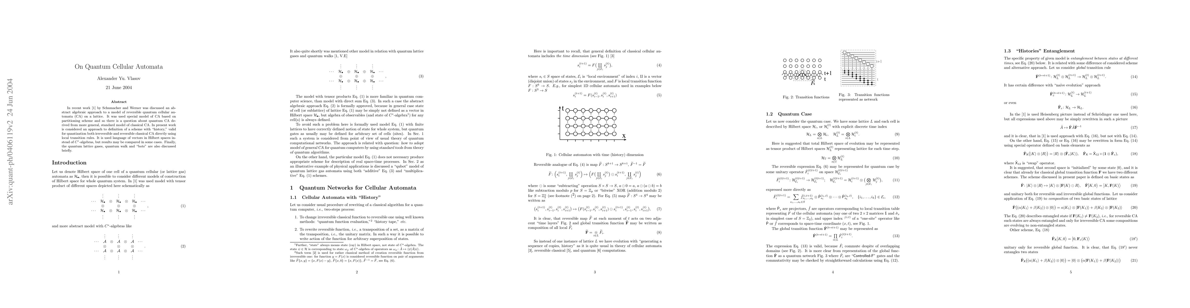 In recent work [quant-ph/0405174] by Schumacher and Werner was discussed an abstract algebraic approach to a model of reversible quantum cellular automata (CA) on a lattice. It was used special model of CA based on partitioning scheme and so there is a question about quantum CA derived from more general, standard model of classical CA. In present work is considered an approach to definition of a scheme with "history", valid for quantization both irreversible and reversible classical CA directly using local transition rules. It is used language of vectors in Hilbert spaces instead of C*-algebras, but results may be compared in some cases. Finally, the quantum lattice gases, quantum walk and "bots" are also discussed briefly.