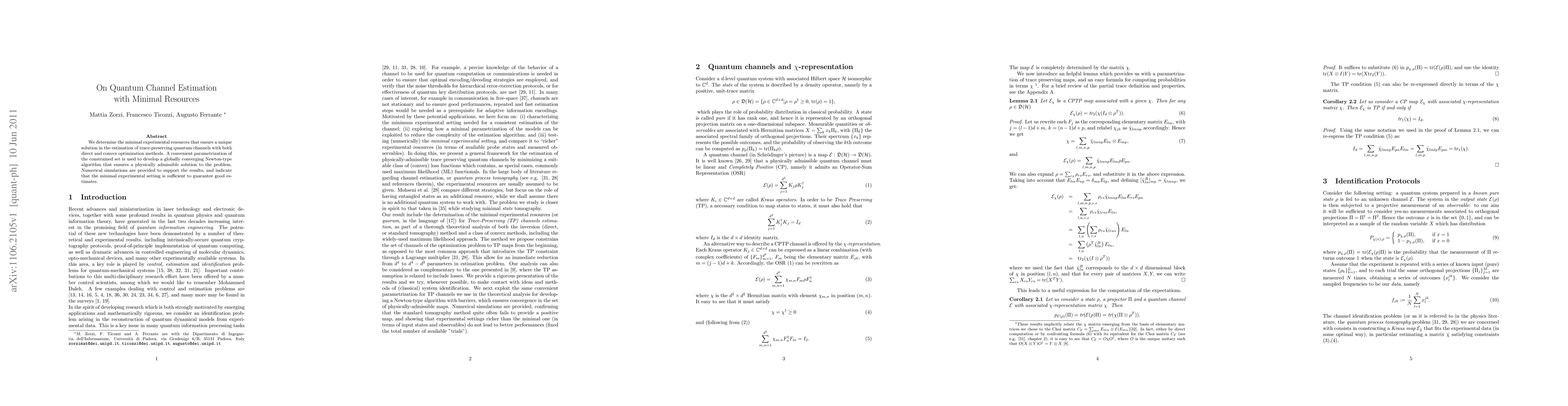 This paper identifies the minimal experimental resources needed for unique estimation of trace-preserving quantum channels using both direct and convex optimization methods. It employs a globally converging Newton-type algorithm for physically admissible solutions, supported by numerical simulations showing the adequacy of the minimal experimental setup.