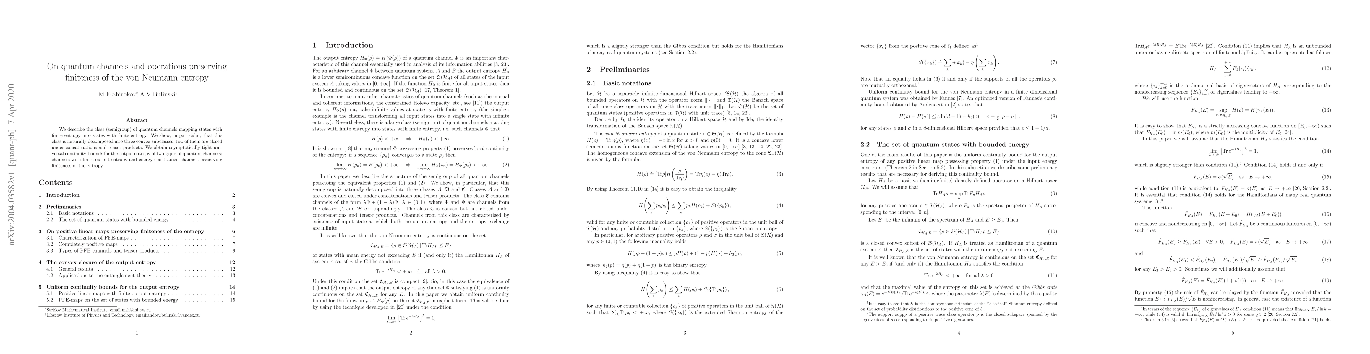 This paper classifies quantum channels that preserve finite von Neumann entropy, decomposing them into three convex subclasses, with two subclasses closed under concatenations and tensor products. It also provides tight bounds for the output entropy of specific quantum channels.