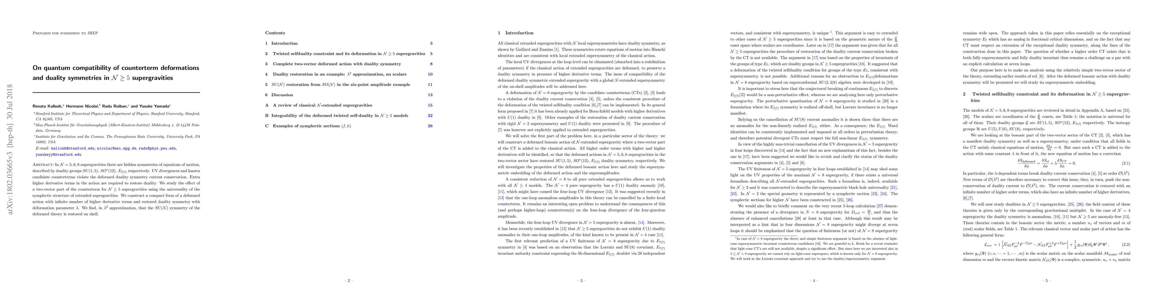This paper explores the restoration of duality symmetries in ${\cal N}\geq 5$ supergravities through counterterm deformations, constructing a deformed action with higher derivative terms that maintains the $SU({\cal N})$ symmetry on shell in the $\lambda^2$ approximation. The study leverages the universality of the symplectic structure of extended supergravities to achieve this restoration.