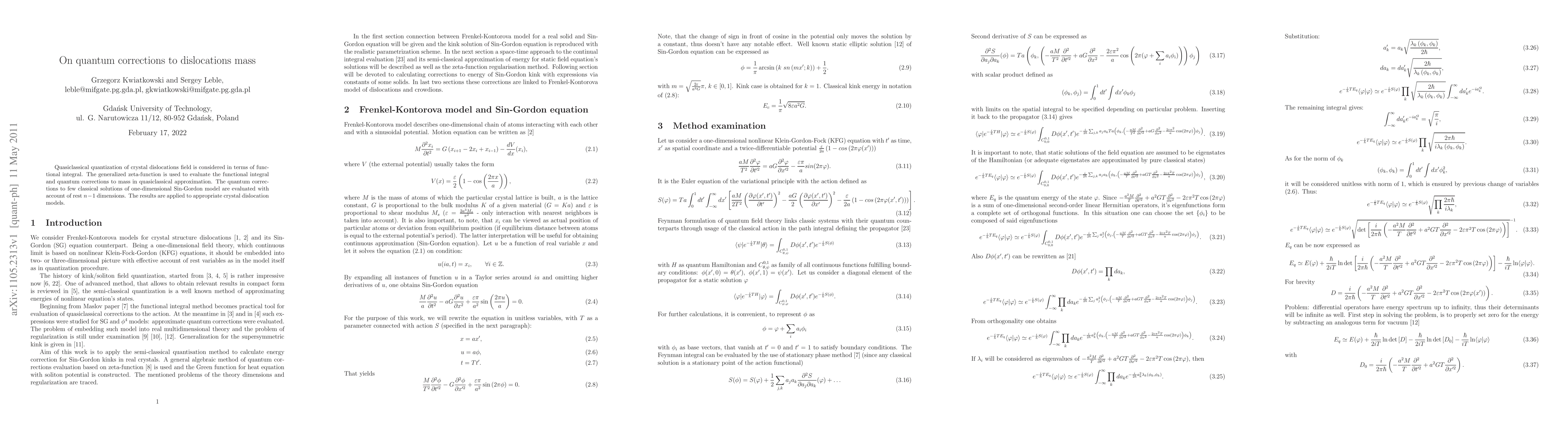 This paper applies quasi-classical quantization of crystal dislocations using a functional integral and generalized zeta-function to compute quantum corrections to dislocation mass. It evaluates these corrections for classical Sin-Gordon model solutions, applying the results to crystal dislocation models.
