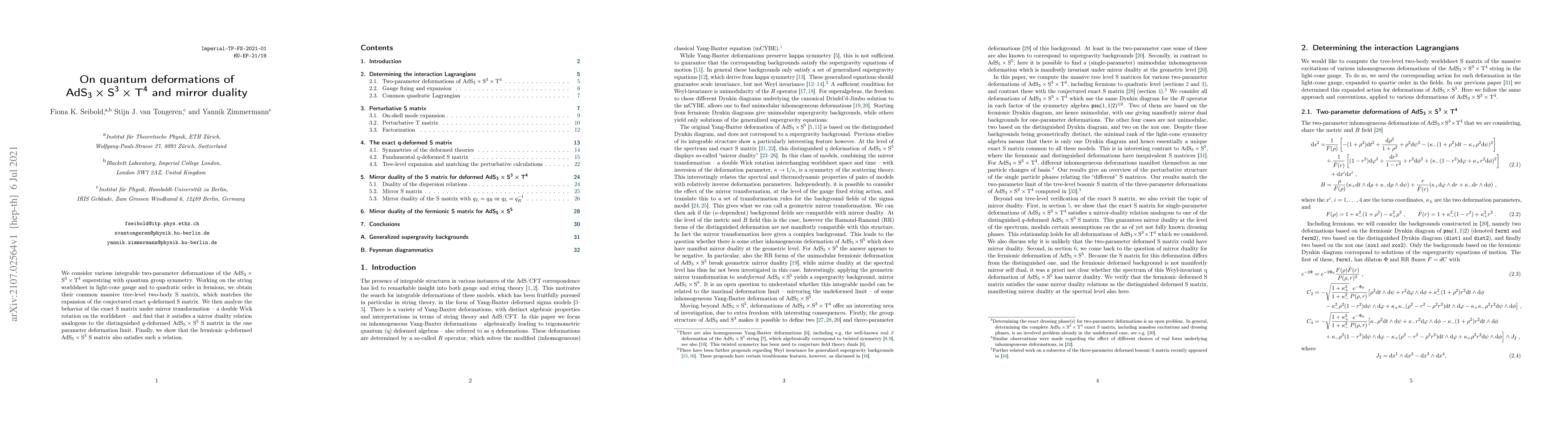 This paper investigates integrable deformations of the $AdS_3 \times S^3 \times T^4$ superstring, deriving a massive two-body S matrix that aligns with a $q$-deformed conjecture. It also explores mirror duality, revealing a relation similar to the $AdS_5 \times S^5$ case under a double Wick rotation.
