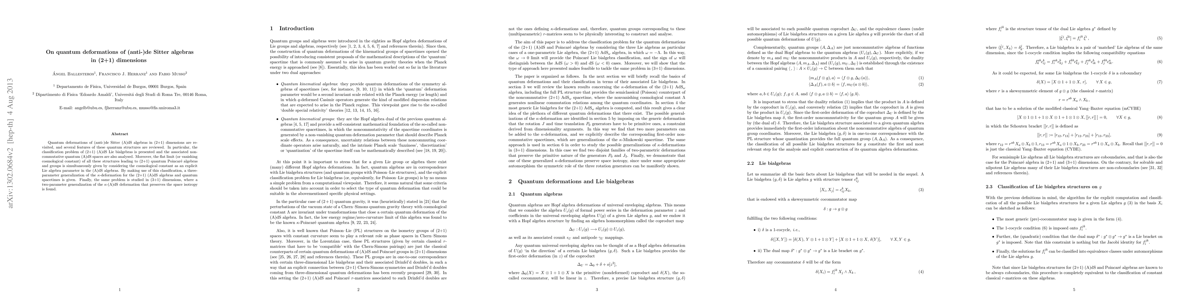 This paper reviews quantum deformations of (anti-)de Sitter algebras in (2+1) dimensions, focusing on the classification of (2+1) (A)dS Lie bialgebras and their associated noncommutative quantum (A)dS spaces. It also presents a three-parameter generalization of the \kappa-deformation and discusses the implications in (3+1) dimensions.
