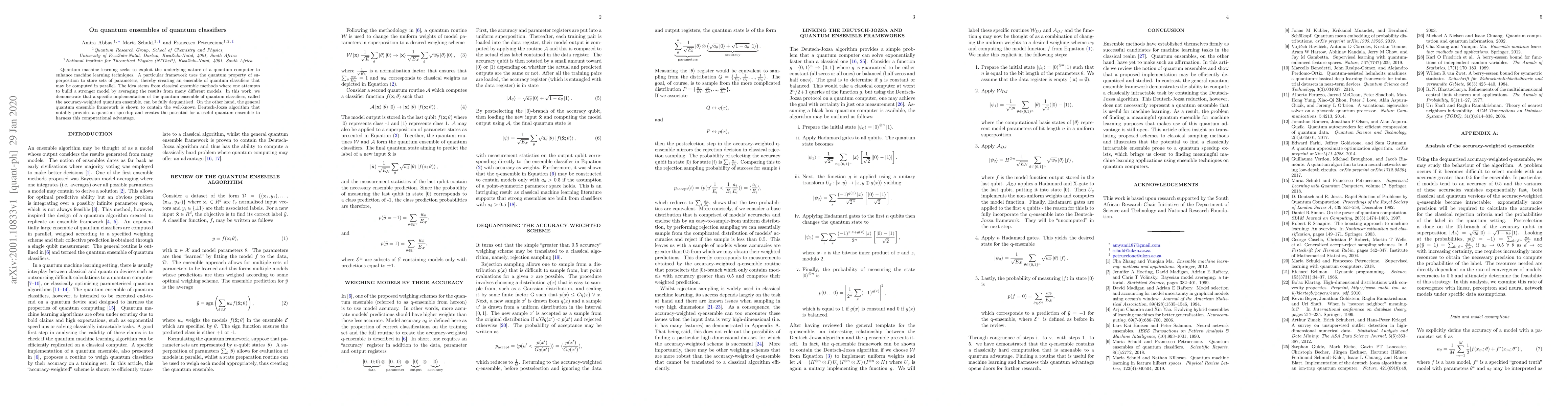 This paper explores quantum machine learning techniques using quantum classifiers in an ensemble framework, leveraging superposition for parallel computation. It demonstrates that a specific implementation, the accuracy-weighted quantum ensemble, can be dequantised, while the general quantum ensemble framework includes the Deutsch-Jozsa algorithm, indicating potential quantum speedup.