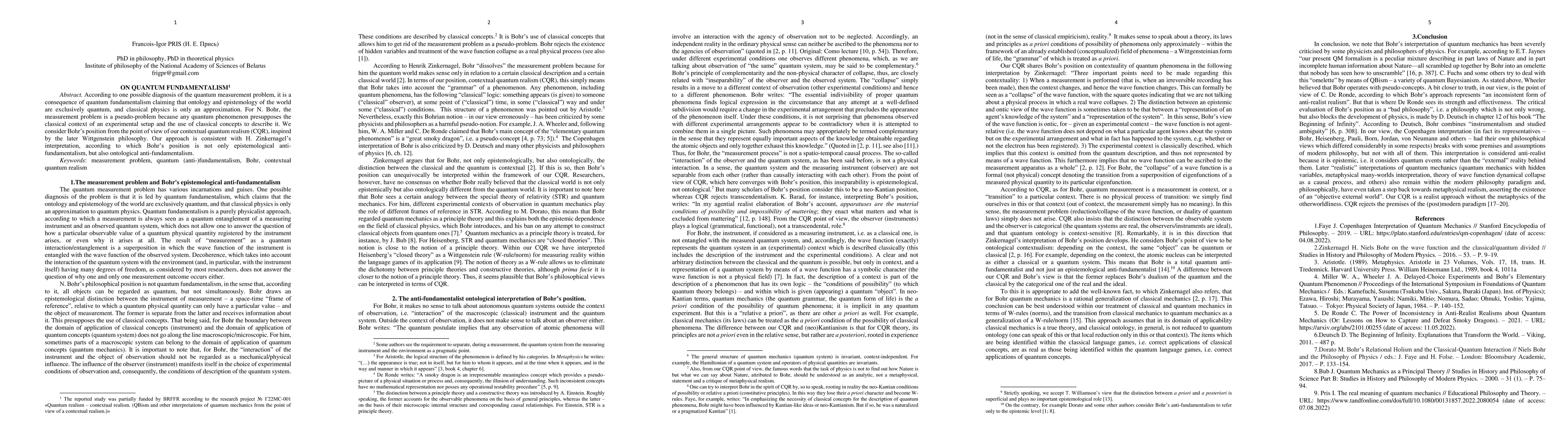 According to one possible diagnosis of the quantum measurement problem, it is a consequence of quantum fundamentalism claiming that ontology and epistemology of the world are exclusively quantum, and classical physics is only an approximation. For N. Bohr, the measurement problem is a pseudo-problem because any quantum phenomenon presupposes the classical context of an experimental setup and the use of classical concepts to describe it. We consider Bohr's position from the point of view of our contextual quantum realism (CQR), inspired by the later Wittgenstein philosophy. Our approach is consistent with H. Zinkernagel's interpretation, according to which Bohr's position is not only epistemological anti-fundamentalism, but also ontological anti-fundamentalism.