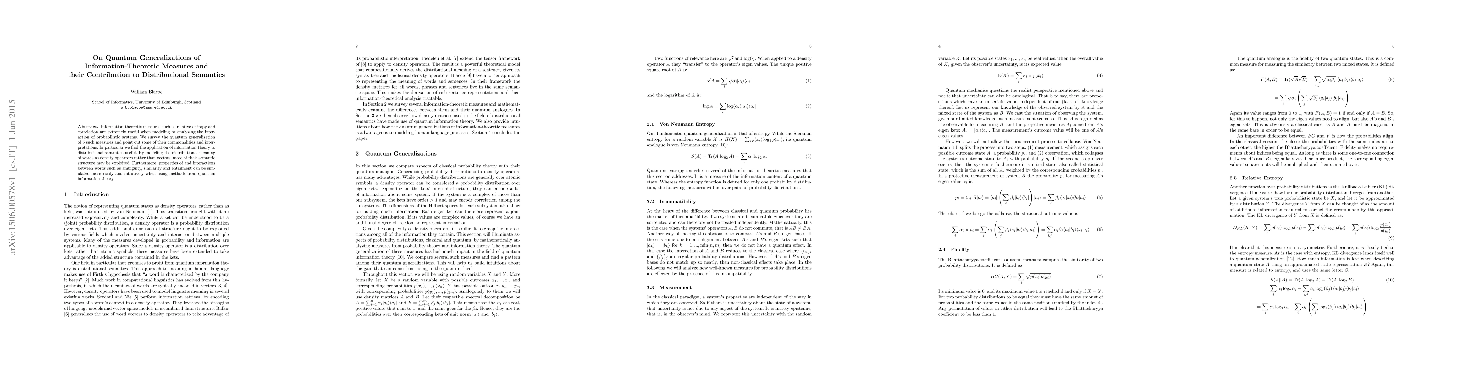 This paper surveys quantum generalizations of information-theoretic measures, highlighting their application to distributional semantics. It models distributional meaning using density operators, enabling richer simulations of word properties like ambiguity and similarity.