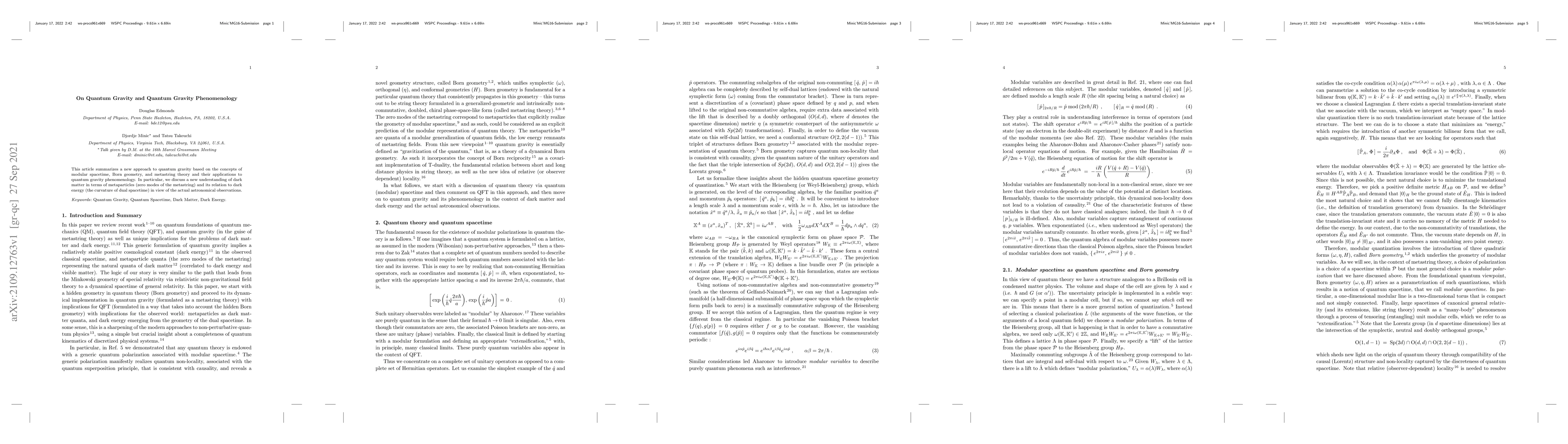 This article summarizes a new approach to quantum gravity based on the concepts of modular spacetime, Born geometry, and metastring theory and their applications to quantum gravity phenomenology. In particular, we discuss a new understanding of dark matter in terms of metaparticles (zero modes of the metastring) and its relation to dark energy (the curvature of dual spacetime) in view of the actual astronomical observations.