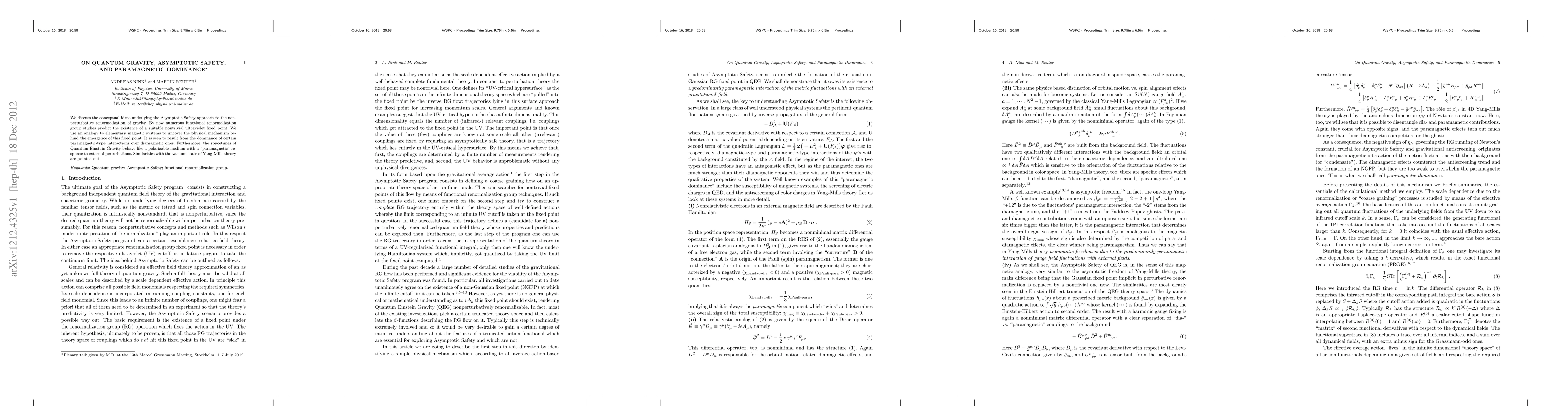 This paper explores the Asymptotic Safety approach to quantum gravity, highlighting the existence of a nontrivial ultraviolet fixed point due to paramagnetic-type interactions. It draws parallels between gravity's behavior and magnetic systems, suggesting that quantum spacetimes respond like a polarizable medium.