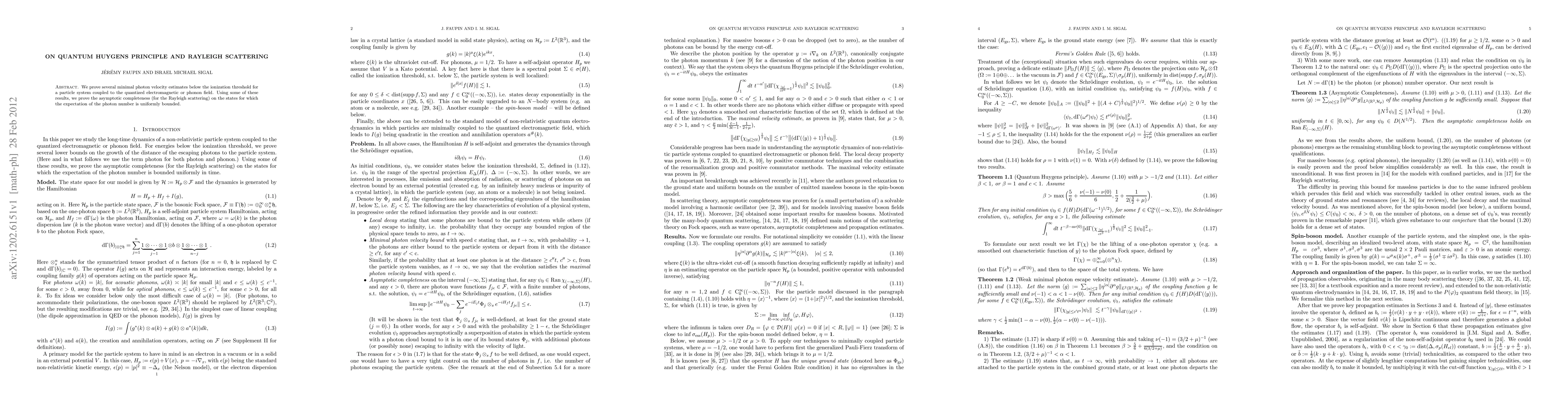 We prove several minimal photon velocity estimates below the ionization threshold for a particle system coupled to the quantized electromagnetic or phonon field. Using some of these results, we prove the asymptotic completeness (for the Rayleigh scattering) on the states for which the expectation of the photon number is uniformly bounded.