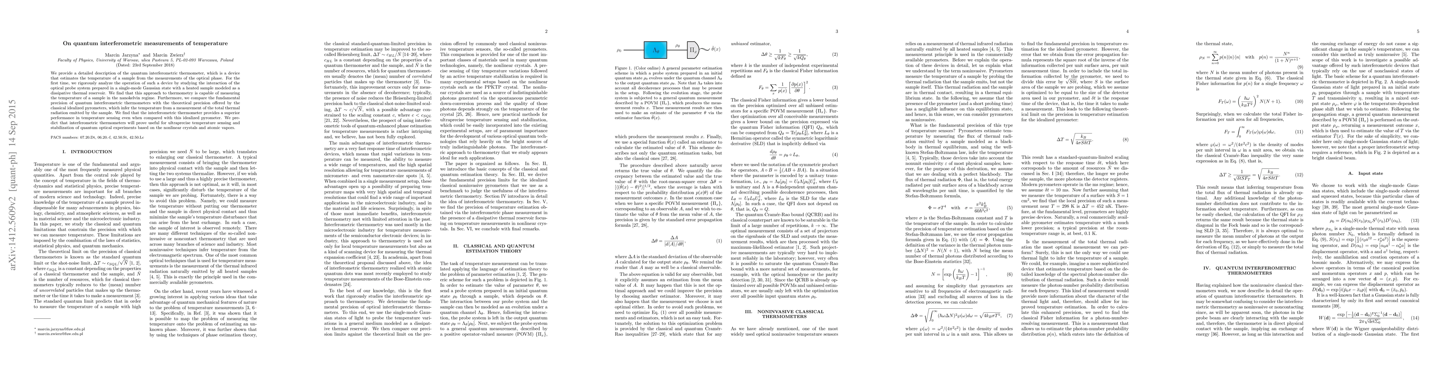 We provide a detailed description of the quantum interferometric thermometer, which is a device that estimates the temperature of a sample from the measurements of the optical phase. For the first time, we rigorously analyze the operation of such a device by studying the interaction of the optical probe system prepared in a single-mode Gaussian state with a heated sample modeled as a dissipative thermal reservoir. We find that this approach to thermometry is capable of measuring the temperature of a sample in the nanokelvin regime. Furthermore, we compare the fundamental precision of quantum interferometric thermometers with the theoretical precision offered by the classical idealized pyrometers, which infer the temperature from a measurement of the total thermal radiation emitted by the sample. We find that the interferometric thermometer provides a superior performance in temperature sensing even when compared with this idealized pyrometer. We predict that interferometric thermometers will prove useful for ultraprecise temperature sensing and stabilization of quantum optical experiments based on the nonlinear crystals and atomic vapors.