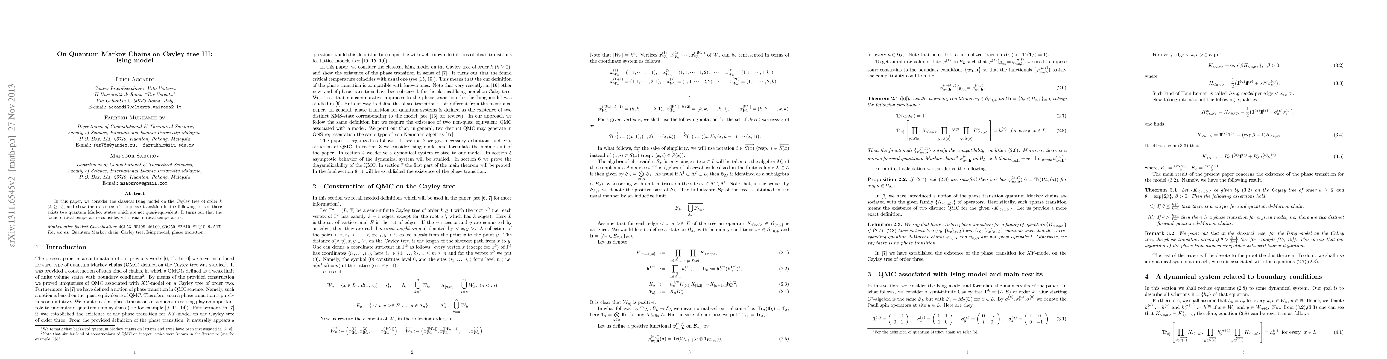 This paper investigates the classical Ising model on a Cayley tree of order k, demonstrating the existence of a phase transition characterized by two non-quasi-equivalent quantum Markov states. The critical temperature identified matches the conventional critical temperature.