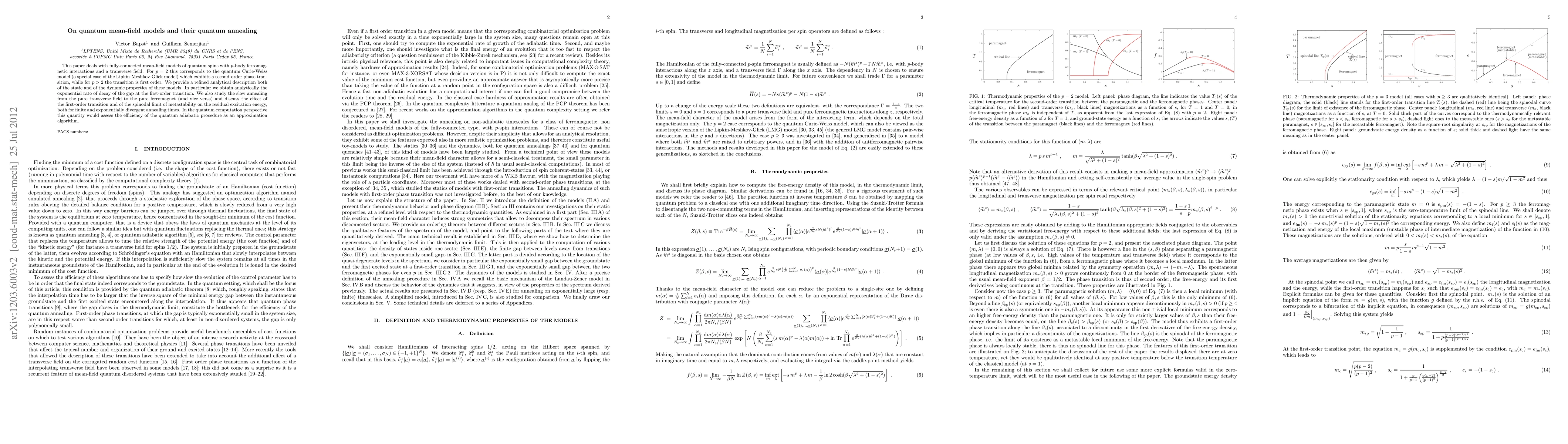 This paper analyzes fully-connected quantum mean-field models with p-body ferromagnetic interactions and a transverse field, providing refined analytical descriptions of their static and dynamic properties. It focuses on the exponential rate of decay of the gap at first-order transitions and the effects on residual excitation energy during quantum annealing, assessing the efficiency of quantum adiabatic procedures.