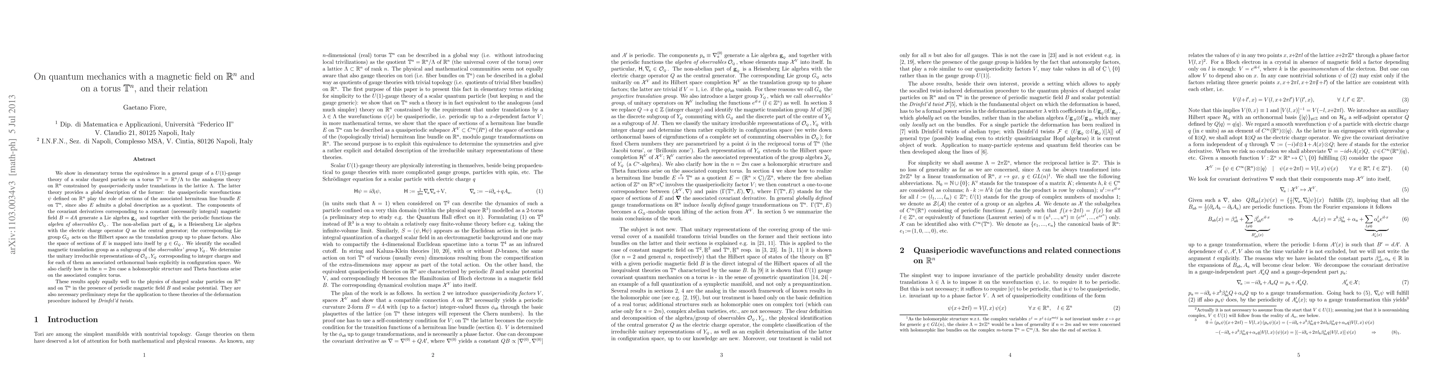 We show in elementary terms the equivalence in a general gauge of a U(1)-gauge theory of a scalar charged particle on a torus T^n = R^n/L to the analogous theory on R^n constrained by quasiperiodicity under translations in the lattice L. The latter theory provides a global description of the former: the quasiperiodic wavefunctions defined on R^n play the role of sections of the associated hermitean line bundle E on T^n, since also E admits a global description as a quotient. The components of the covariant derivatives corresponding to a constant (necessarily integral) magnetic field B = dA generate a Lie algebra g_Q and together with the periodic functions the algebra of observables O_Q . The non-abelian part of g_Q is a Heisenberg Lie algebra with the electric charge operator Q as the central generator; the corresponding Lie group G_Q acts on the Hilbert space as the translation group up to phase factors. Also the space of sections of E is mapped into itself by g in G_Q . We identify the socalled magnetic translation group as a subgroup of the observables' group Y_Q . We determine the unitary irreducible representations of O_Q, Y_Q corresponding to integer charges and for each of them an associated orthonormal basis explicitly in configuration space. We also clarify how in the n = 2m case a holomorphic structure and Theta functions arise on the associated complex torus. These results apply equally well to the physics of charged scalar particles on R^n and on T^n in the presence of periodic magnetic field B and scalar potential. They are also necessary preliminary steps for the application to these theories of the deformation procedure induced by Drinfel'd twists.