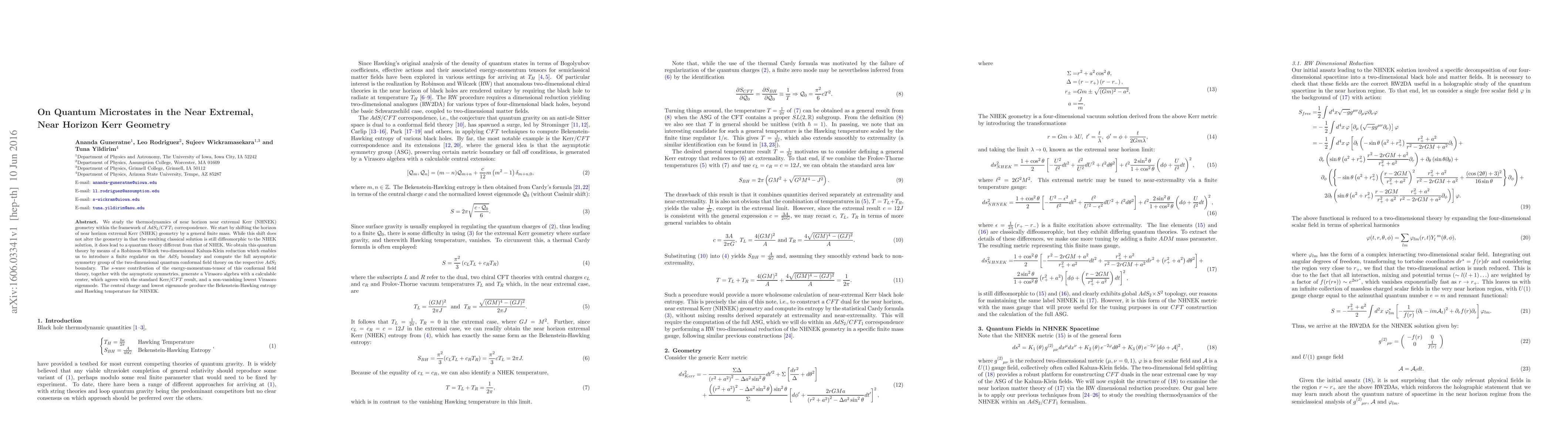 This research explores the thermodynamics of near horizon near extremal Kerr geometry via the AdS₂/CFT₁ correspondence, revealing a distinct quantum theory through a Robinson-Wilczek Kaluza-Klein reduction. The study identifies a Virasoro algebra with a calculable center and a non-vanishing lowest eigenmode, which correlates to Bekenstein-Hawking entropy and Hawking temperature.
