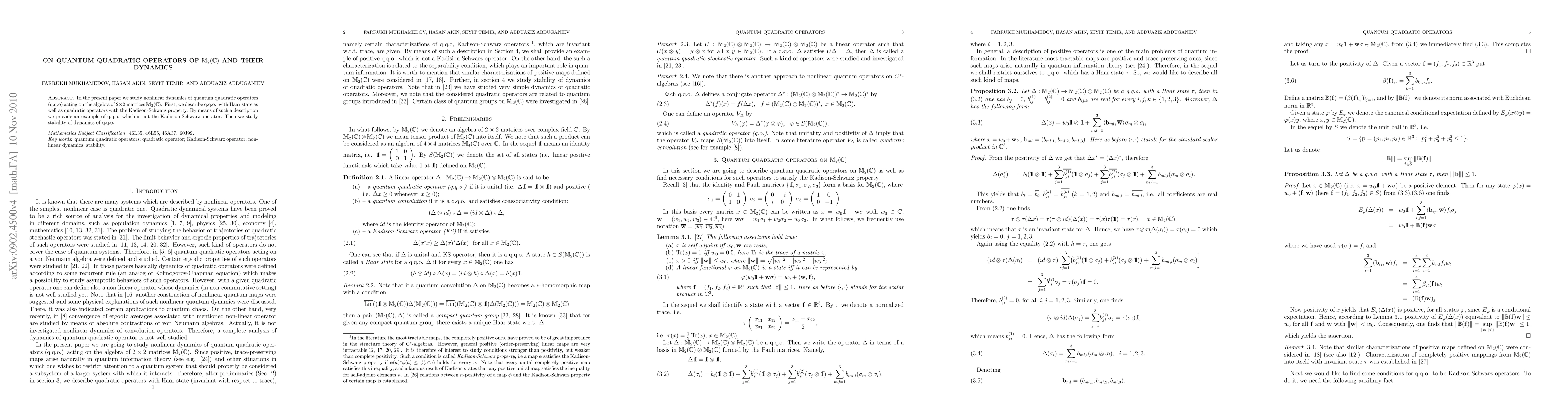 In the present paper we study nonlinear dynamics of quantum quadratic operators (q.q.o) acting on the algebra of $2\times 2$ matrices $\bm_2(\bc)$. First, we describe q.q.o. with Haar state as well as quadratic operators with the Kadison-Schwarz property. By means of such a description we provide an example of q.q.o. which is not the Kadision-Schwarz operator. Then we study stability of dynamics of q.q.o.