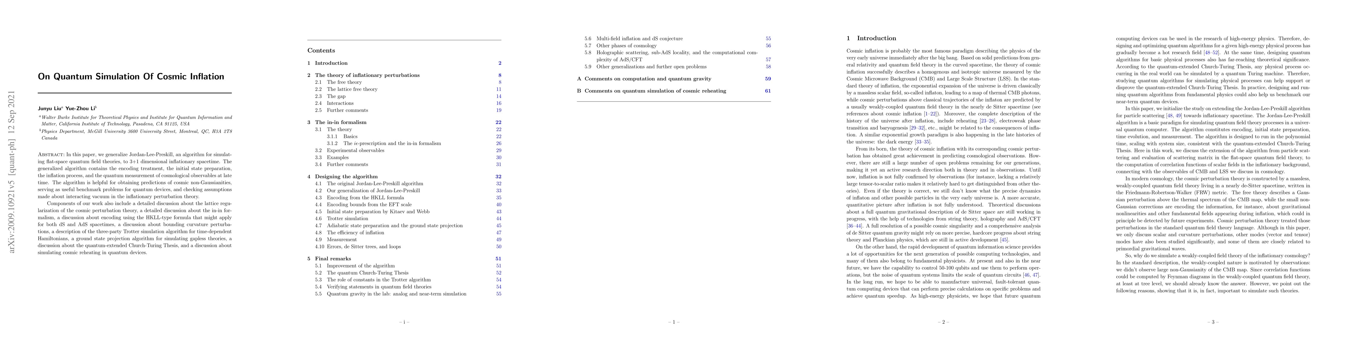 In this paper, we generalize Jordan-Lee-Preskill, an algorithm for simulating flat-space quantum field theories, to 3+1 dimensional inflationary spacetime. The generalized algorithm contains the encoding treatment, the initial state preparation, the inflation process, and the quantum measurement of cosmological observables at late time. The algorithm is helpful for obtaining predictions of cosmic non-Gaussianities, serving as useful benchmark problems for quantum devices, and checking assumptions made about interacting vacuum in the inflationary perturbation theory. Components of our work also include a detailed discussion about the lattice regularization of the cosmic perturbation theory, a detailed discussion about the in-in formalism, a discussion about encoding using the HKLL-type formula that might apply for both dS and AdS spacetimes, a discussion about bounding curvature perturbations, a description of the three-party Trotter simulation algorithm for time-dependent Hamiltonians, a ground state projection algorithm for simulating gapless theories, a discussion about the quantum-extended Church-Turing Thesis, and a discussion about simulating cosmic reheating in quantum devices.